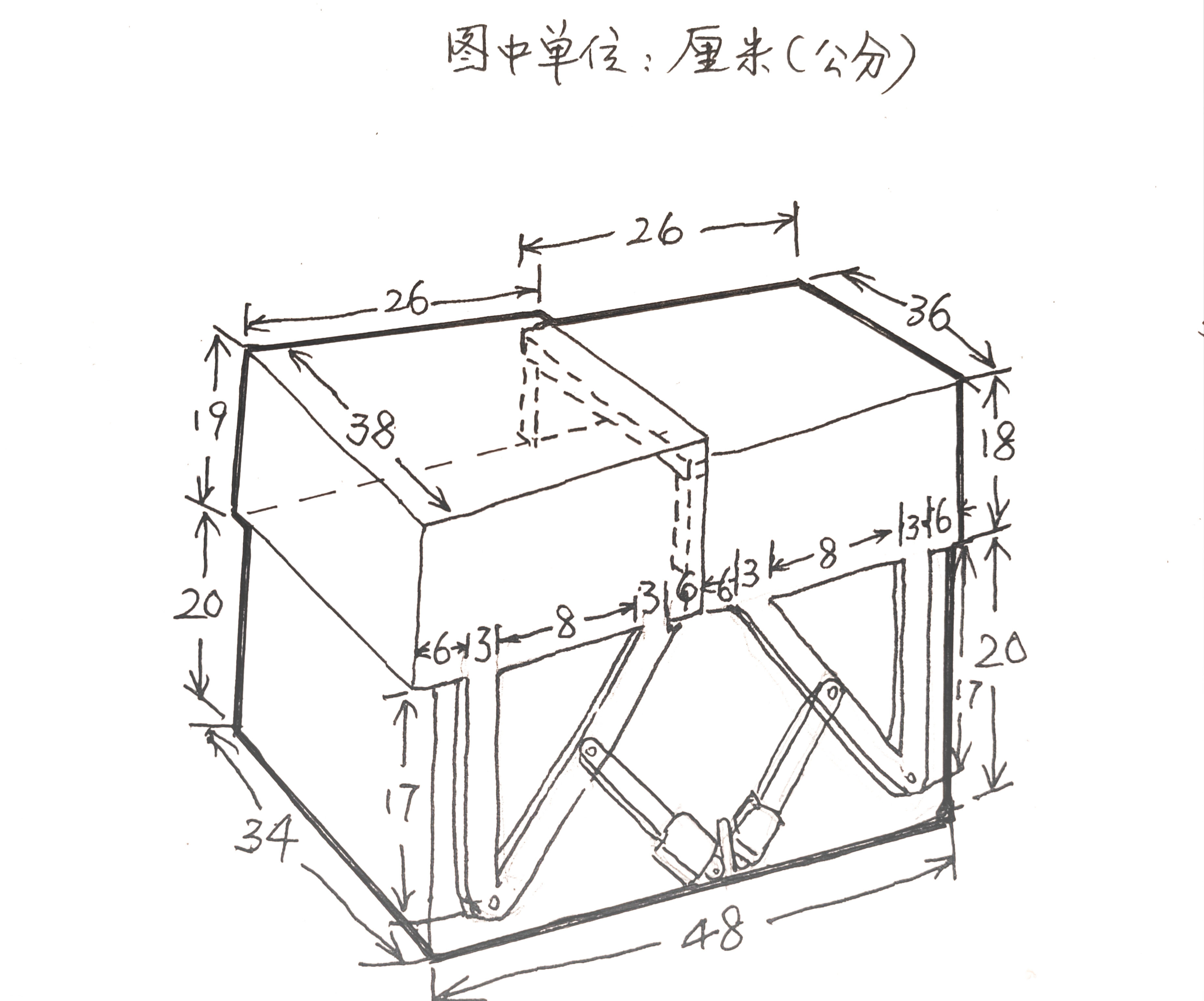 1、考虑到网络电波信号的透过性问题。微型天文台的箱体采用胶合板制作。上盖用9mm胶合板。下箱体用15mm胶合板。刷三层灰色油漆。(结构和尺寸见下图)