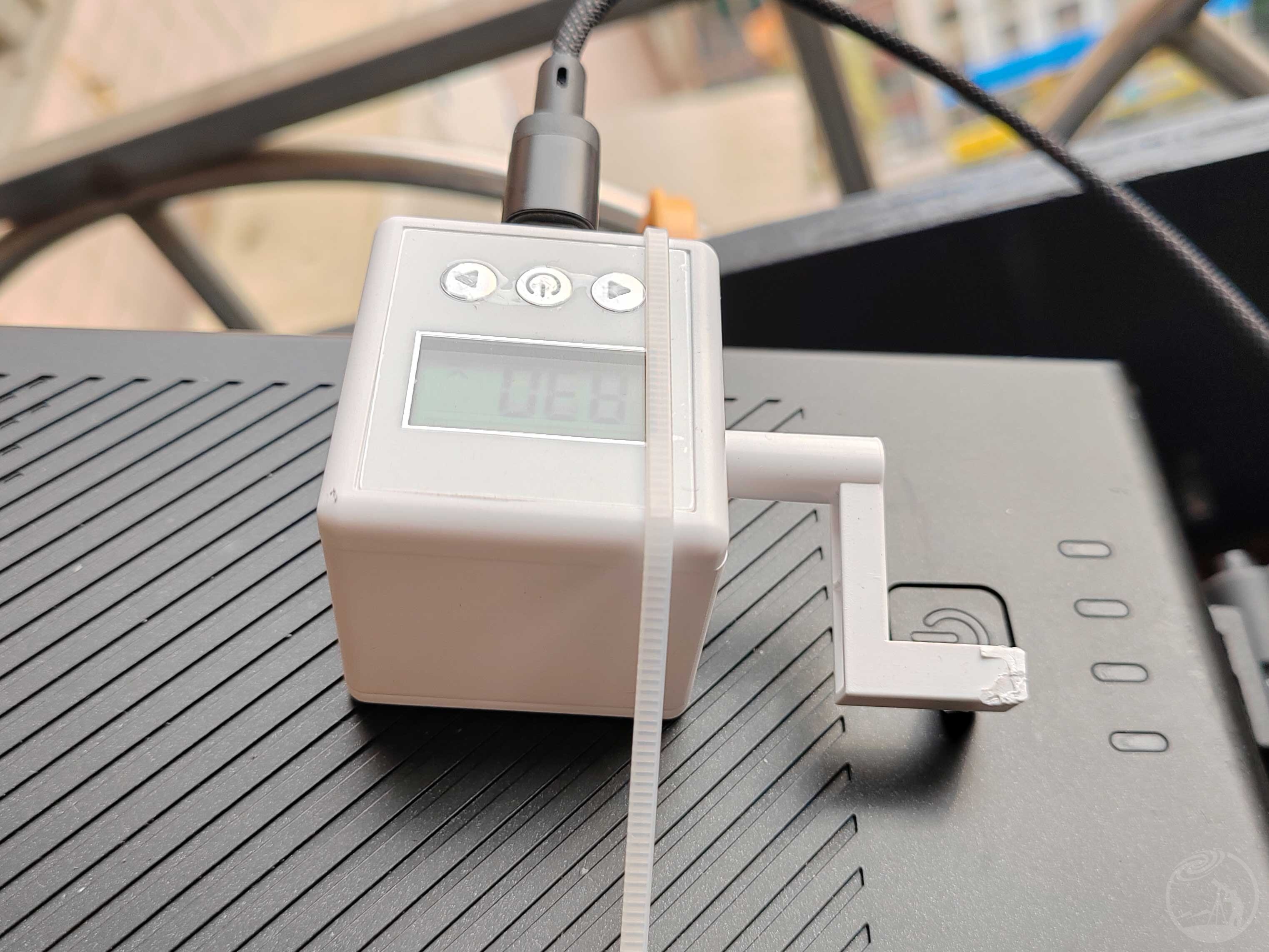 B、电源开关:如图将手指置于望远镜电源开关上方。记得将手指机器人设定为:点动模式,延时3秒钟释放。(白色胶带是固定手指机器人用,原底座是粘贴的,不牢靠)