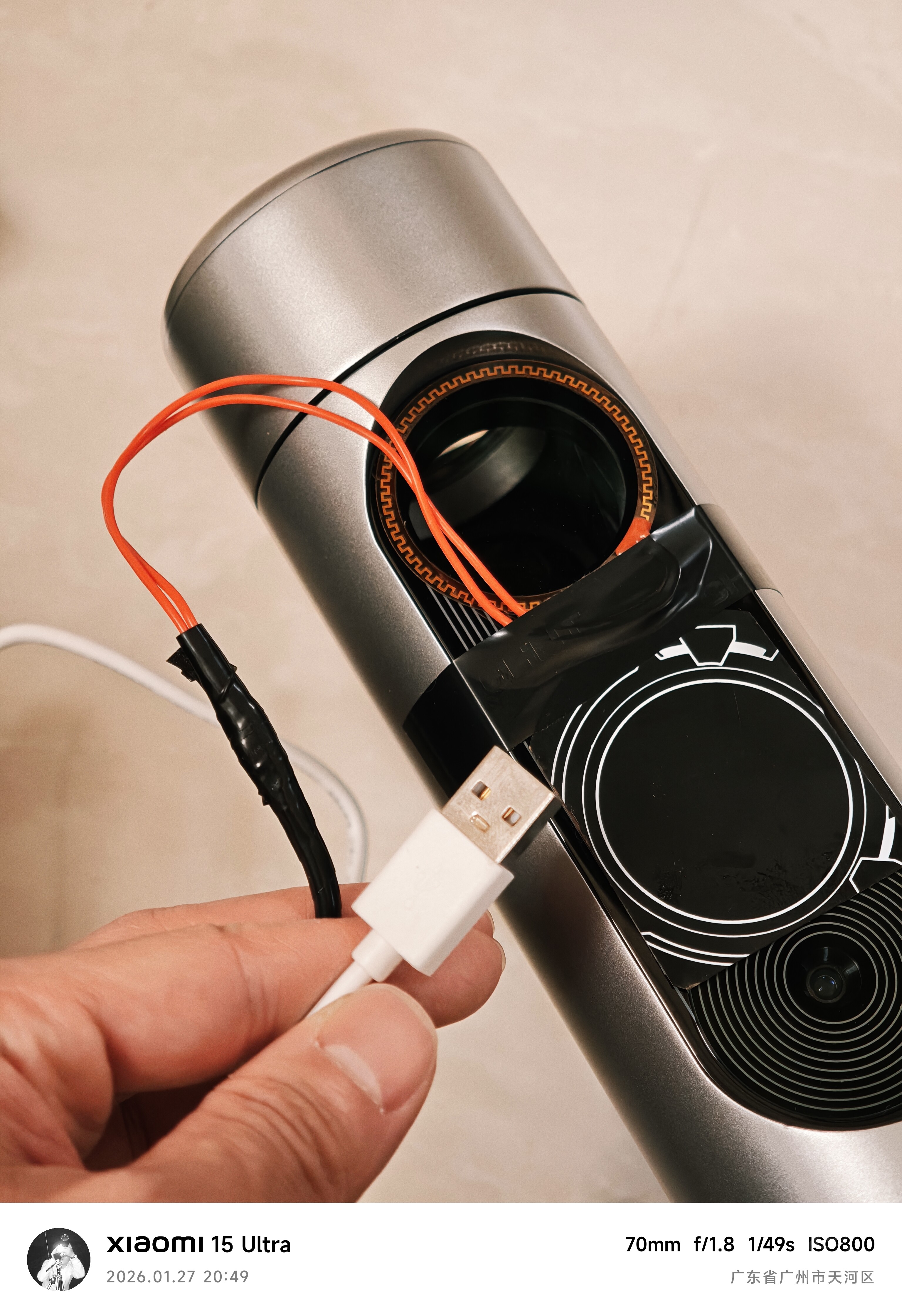 在实践以后,发现在贴上手机半导体散热器后半夜,镜头会起雾。D3是没有镜筒加热功能的,是使用cmos的热量导到镜头区的去雾,在对cmos进行散热后,镜头组就过冷起雾了。于是KUMA佬探索尺寸后,使用发热片进行解决。尺寸是外44mm,内38mm,12V5.5W规格的发热膜片,刚好不会遮挡!供电的话严格来说需要DC供电并且加上温控,一看成本就爆了绝对不干这种事。直接使用一个A口充电线剪掉并接线就行,实际功率在1-2瓦左右,由于功率过低,可能导致不激活充电宝,所以需要和散热器一起供电激活充电宝持续供电。