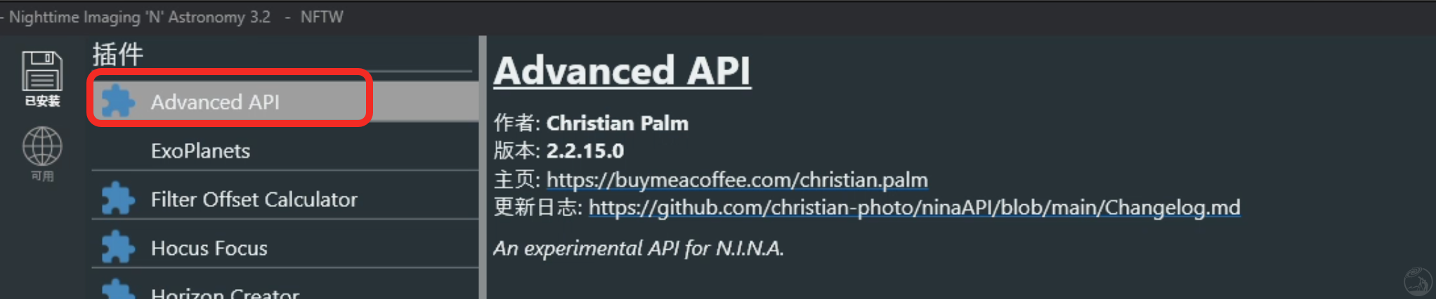 步骤一:安装 NINA Advanced API 插件