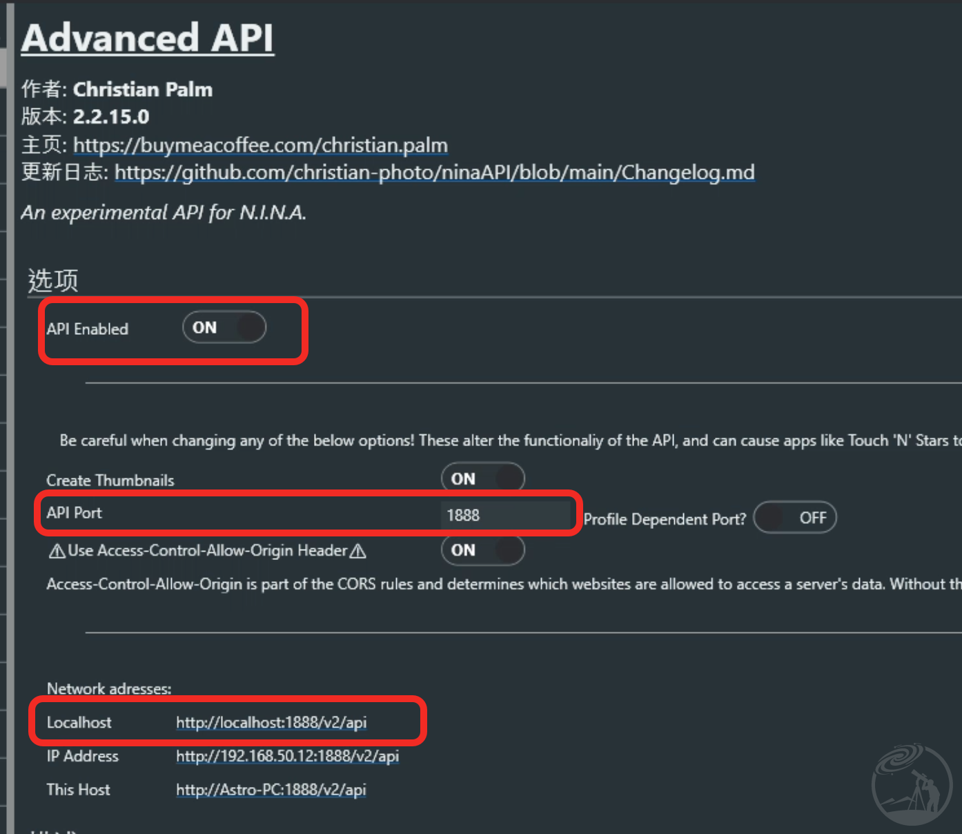 安装完成后,NINA API 插件会暴露一个 HTTP API endpoint(默认端口可在插件设置中查看)。