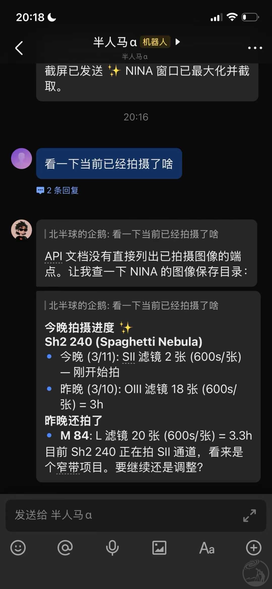 • OpenClaw 会自动解析您的指令,调用相应的 NINA API 接口,完成远程拍摄控制。
