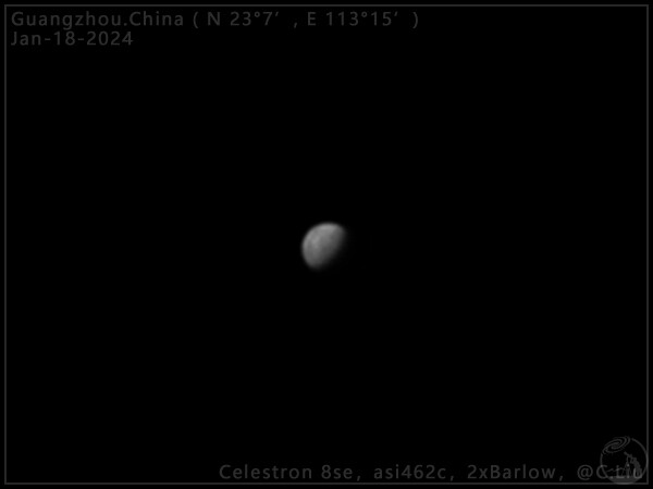 拍摄水星的当天视宁度并不是很好,但晴天难得,还是赌一把去试试,从水星高度角只有3度开始跟踪,一直跟到30度左右,中间有一段时间大气异常平静,我抓住这段黄金时间,赶紧拍了很多段素材,后期发现明显要比其他素材锐度要高,经过反复的后期锐化,细节逐渐显现,大概拍了五万多帧,拍了20多段,最后有3000多帧去叠加,信噪比上控制的还算可以,最后与软件对比,发现拍到的都是实实在在的细节!这仅仅是我第二次拍摄水星!作为一位在校高中生还是非常兴奋的