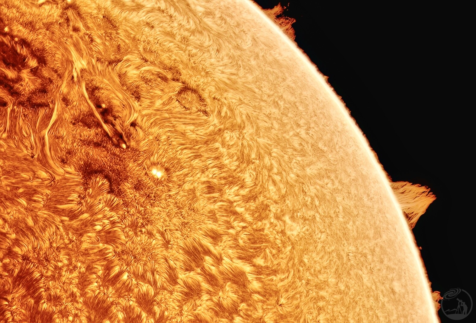 展示了太阳色球层丰富的结构,黑子、耀斑、暗条、日珥、针状物等。