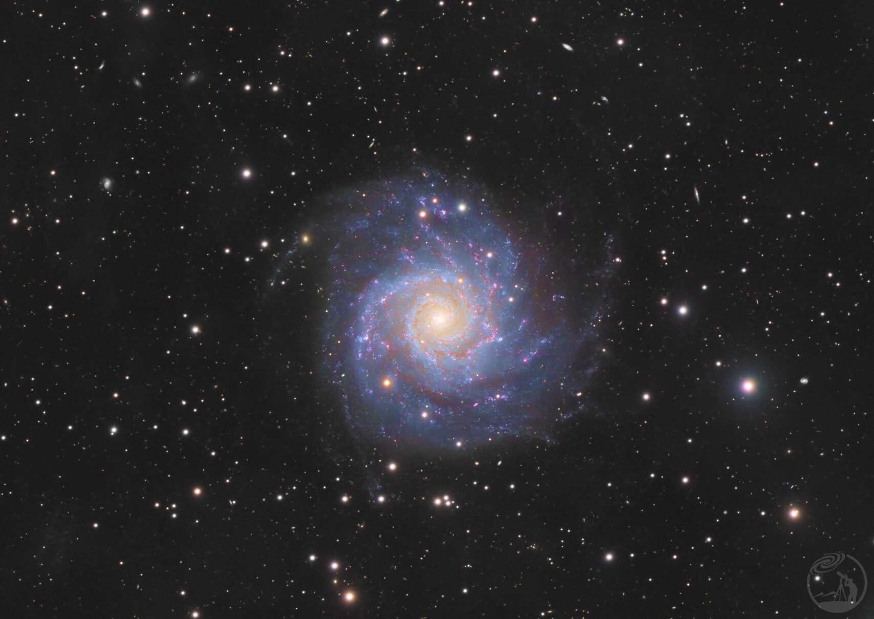 M74(NGC 628)位于双鱼座的正面螺旋星系,因其优雅的对称旋臂被誉为“完美的漩涡星系”。星系两条清晰的旋臂上分布着明亮的蓝色年轻星团、粉红色恒星形成区以及暗色尘埃带,呈现出典型的宏观螺旋结构。 星系周围散落着众多更加遥远渺小的小星系,很值得细细品味。星系周围弥散的IFN给后期处理增加了不小的困难,尝试多种拉伸没有得到特别好的效果。