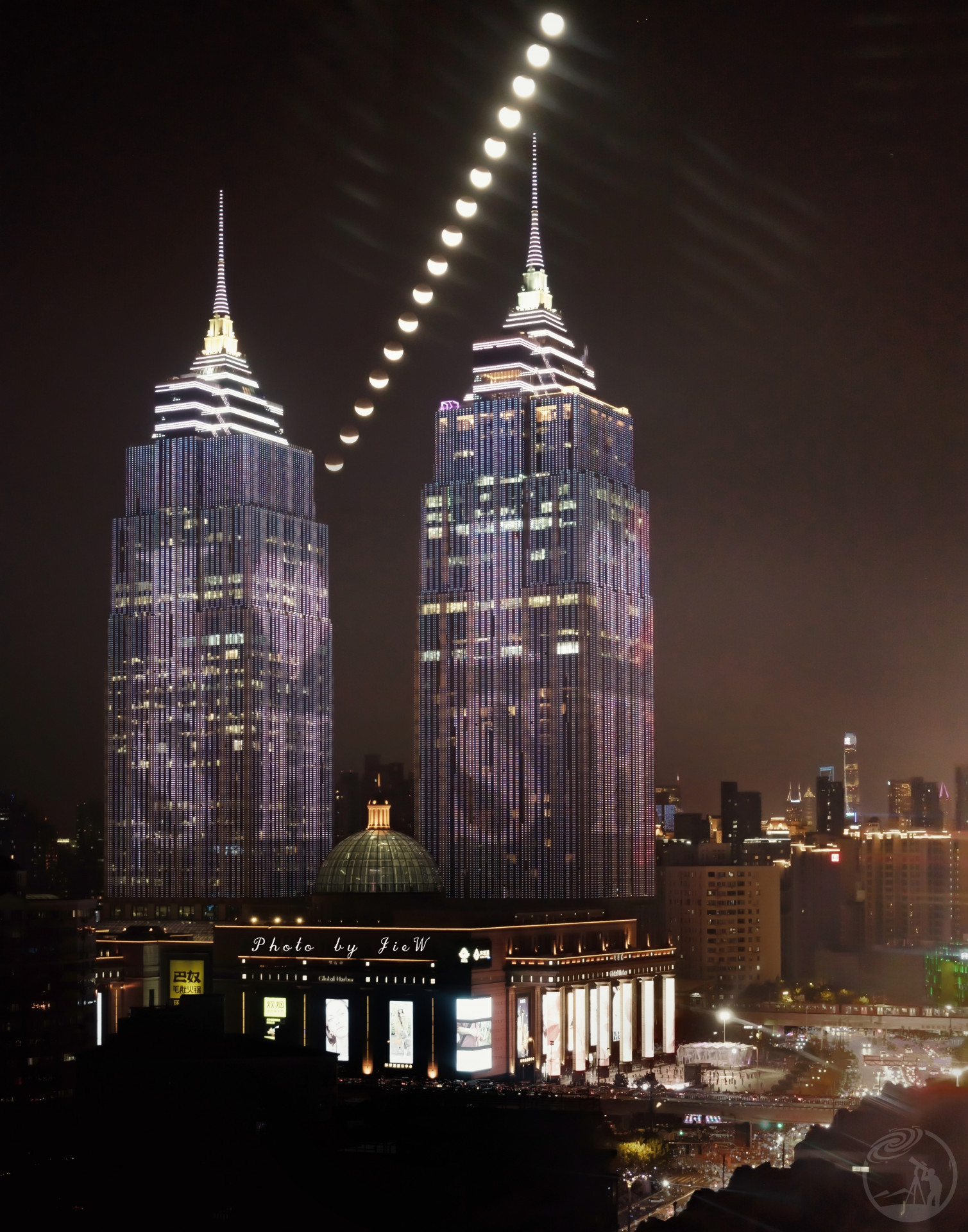 在华师大田家炳楼的一处楼梯间 擦了很久的玻璃 月食刚出来的一部分被环球港挡住了 所以只拍到了一部分 在照片右侧可以见到远处的上海中心 和近处下班的人群车流以及地铁