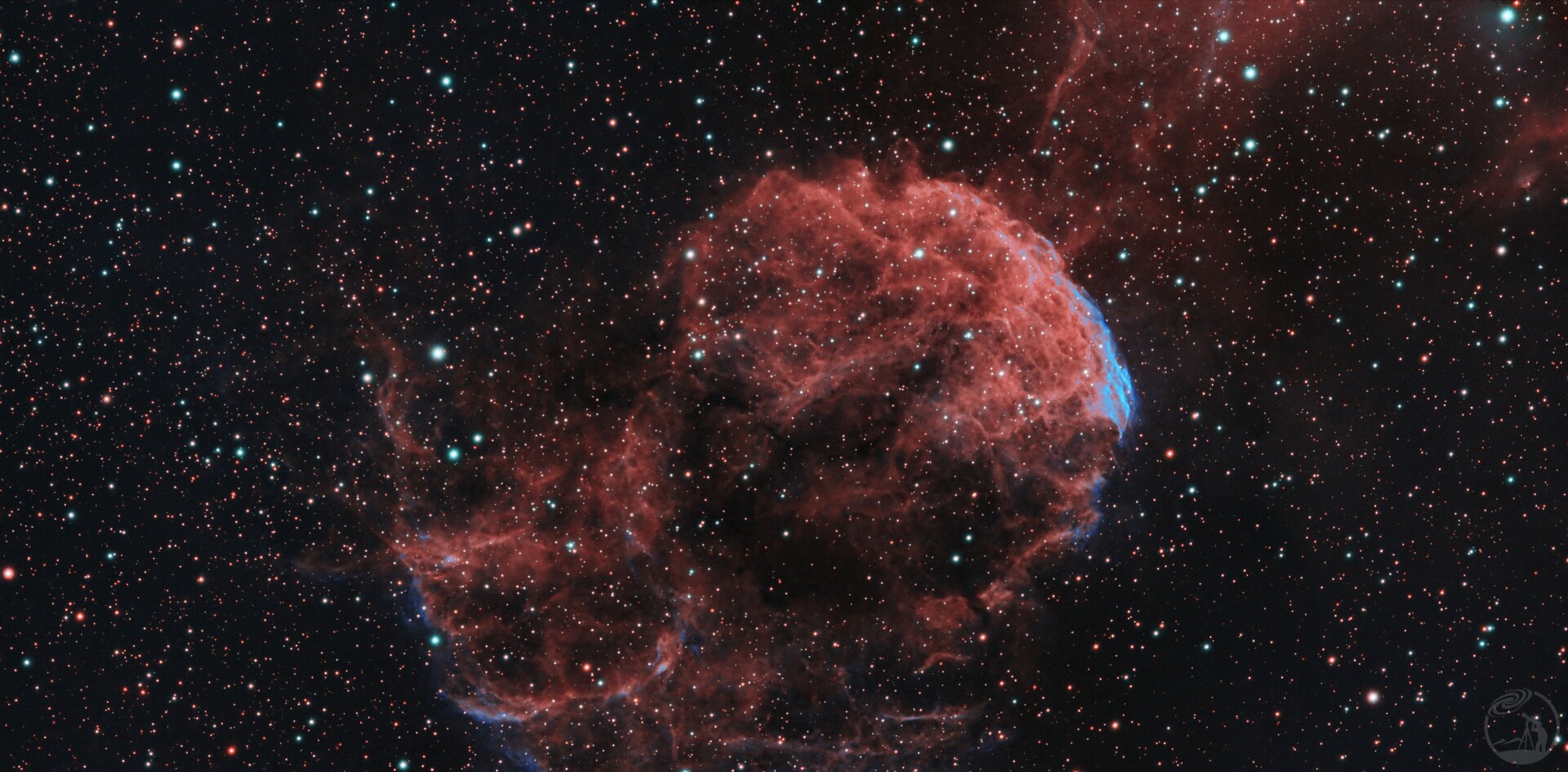 - 较暗的细丝状的星云气体很明显地延伸到上半部以及新月形状的左方。
