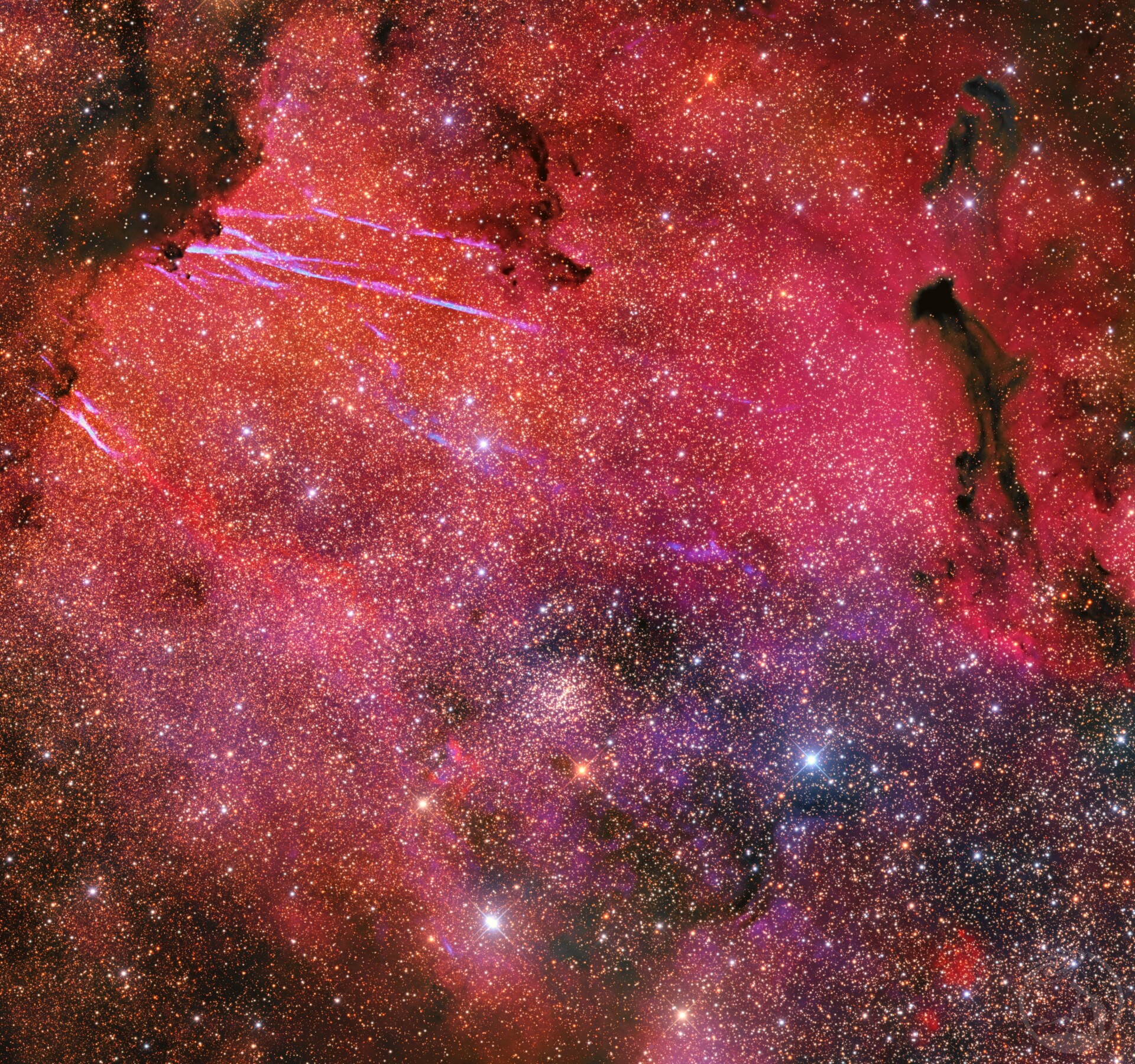 仰观夏季银河,在人马座的茶壶上方,银心有一片特别明亮的区域-那里就是M24,又称人马座小恒星云。梅西耶爵士把它列入容易与彗星混淆的深空天体第24位,而实际上这里是银河系最密集的恒星聚集区之一。而隐藏在M24表面看似平平无奇的密集恒星背后的是一片非常壮丽的OIII瀑流,如同划过银河的闪电一般。因此,对于新手来说,M24可能会被认为是梅西耶天体中最无聊的之一,但是对于资深天文摄影爱好者来说,M24就是银河中最瑰丽的宝藏天区之一。 数据租用智利台T3拍摄,RGBHO总曝光1020分钟。