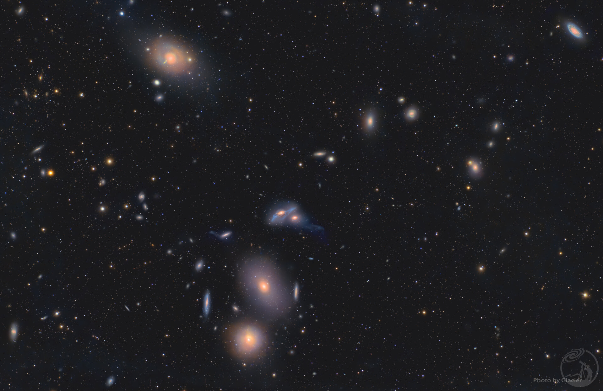 本作品展示了位于室女座星系团核心区域的著名天体结构——马卡良星系链(Markarian's Chain)。画面呈现了一组在视线上连成弧线的星系,这些星系在空间物理上也具有关联性,共同构成了室女座星系团中一个显著的子结构。