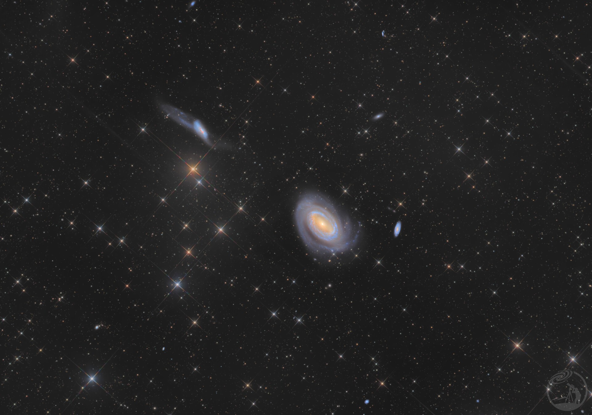 背景中布满了密集的场星,涵盖了从亮蓝色到橙红色的不同光谱类型恒星,部分亮星呈现出明显的衍射芒。这些前景恒星与背景星系共同构成了丰富的深空视场。NGC 4725与NGC 4747在视线上距离较近,尽管它们在物理空间上可能相距数百万光年,但在二维天球投影上形成了紧密的构图关系。画面右侧边缘还可见另一个较小的侧向星系,进一步丰富了该天区的深空细节。整体画面清晰地记录了这两个星系在形态、颜色及结构上的显著差异。