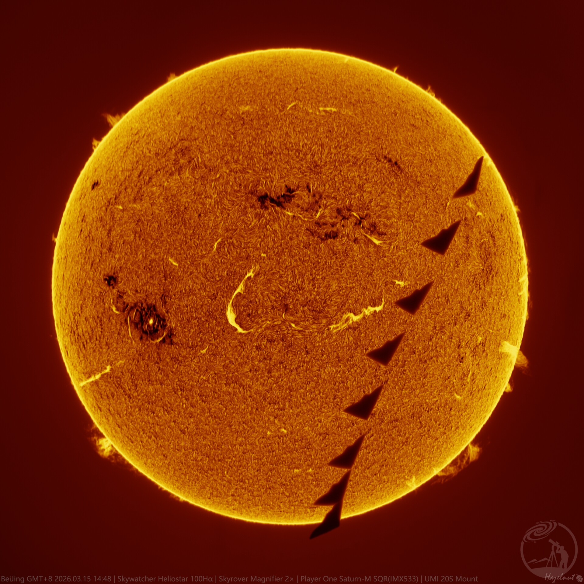 相当意外又十分罕见的十秒。3月15日晴,我照常在家里的阳台拍摄太阳,晚上叠加素材的时候发现下午2点48的一段素材有明显的黑带,于是check该段视频素材,意外地发现有只纸飞机在日面中飘忽飞行了10秒。按A4纸折成的纸飞机大小推测距离我直线距离约200-300米远,按当时太阳高度角36度以及我所在高度推测纸飞机高度约140-200米高,而这个北京二三环之间的区域并没有这么高的楼,大概是冯虚御风,扶摇直上正好被我记录下来。