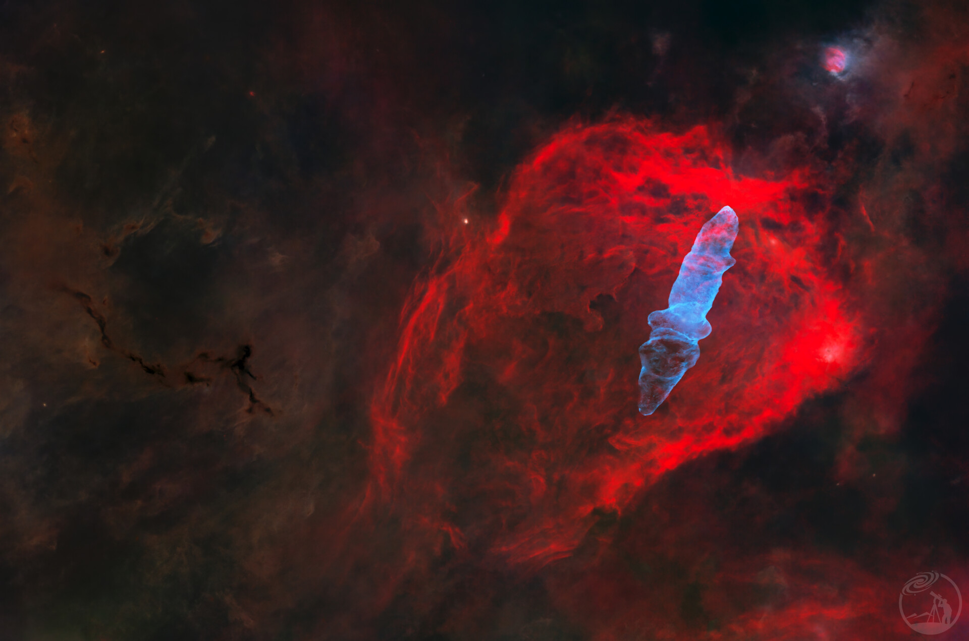飞猪佬的巨素材,处理水平有限。 蓝色的鱿鱼畅游在红色氢海中,旁边的暗星云像一个捕手,慢慢接近。