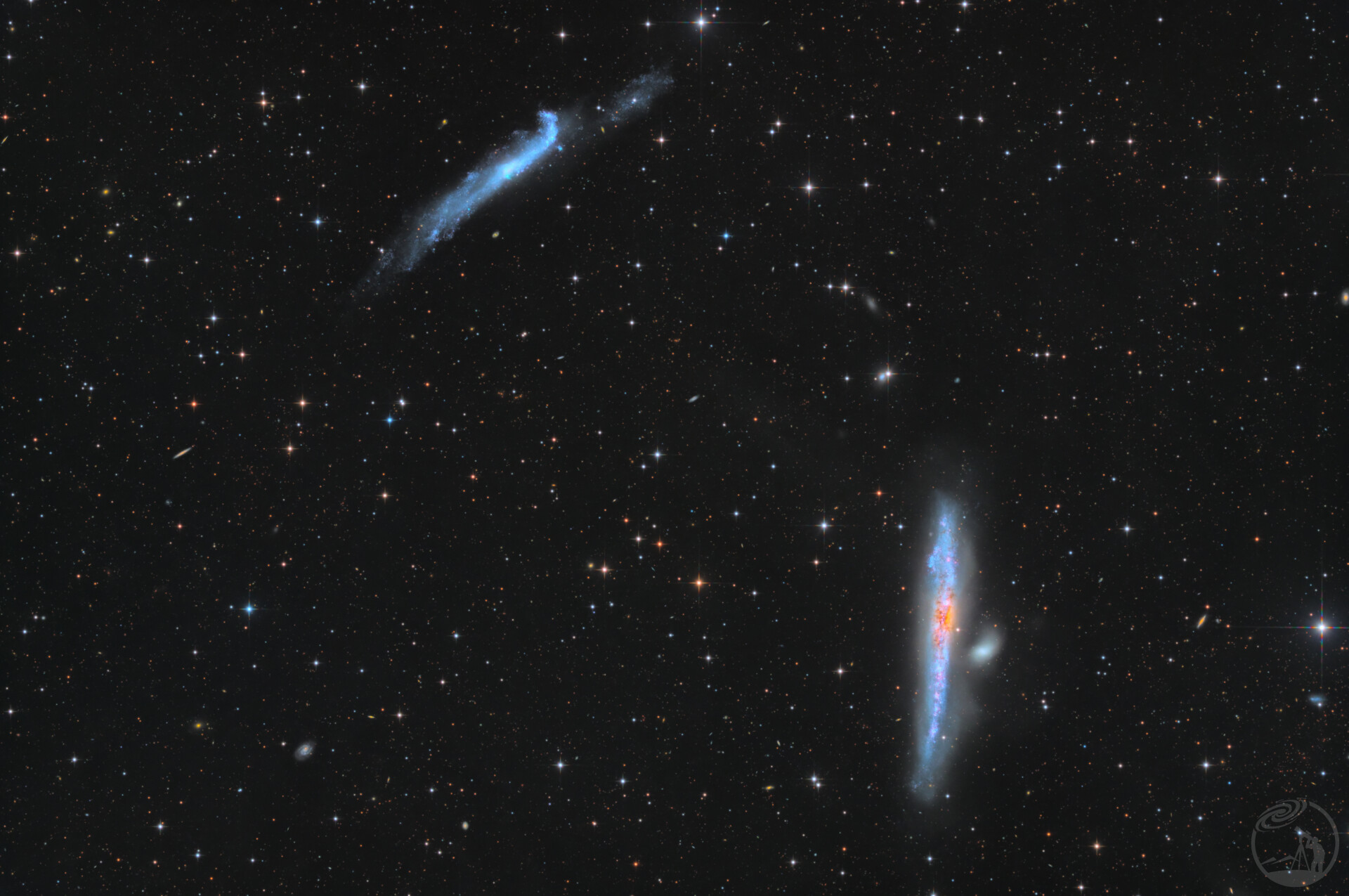 鲸鱼星系(NGC 4631)与鱼钩星系(NGC 4656/7)是位于猎犬座的一对著名互动星系,距离地球约2500万光年。