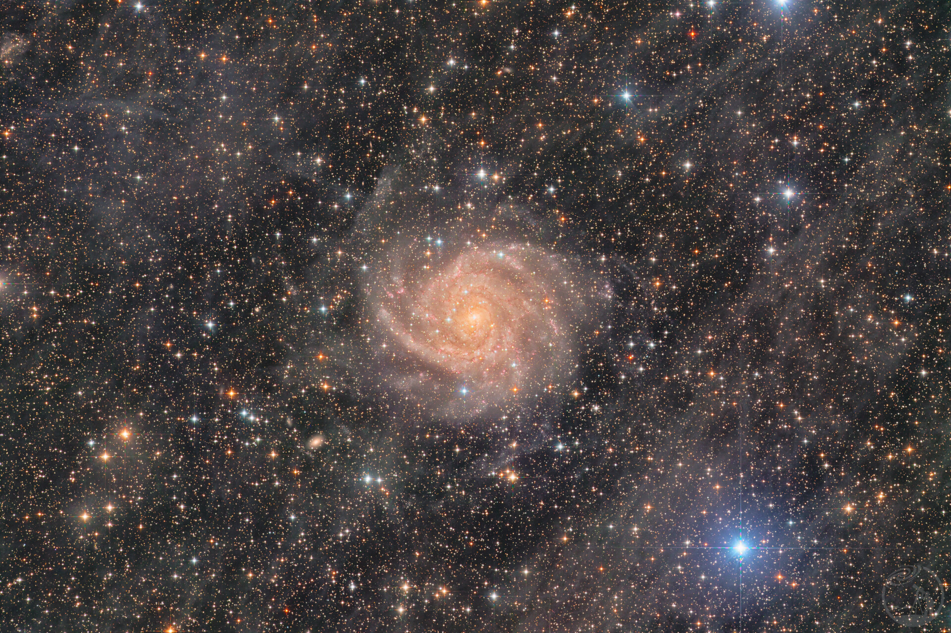 IC 342 位于北天长颈的星座鹿豹座方向,距离我们仅 1000 万光年。 IC 342 宛如广阔的岛宇宙,本应在我们的夜空中成为耀眼的星系,但它被我们银河系平面上的恒星、气体和尘埃云的面纱遮蔽,只能隐约可见。