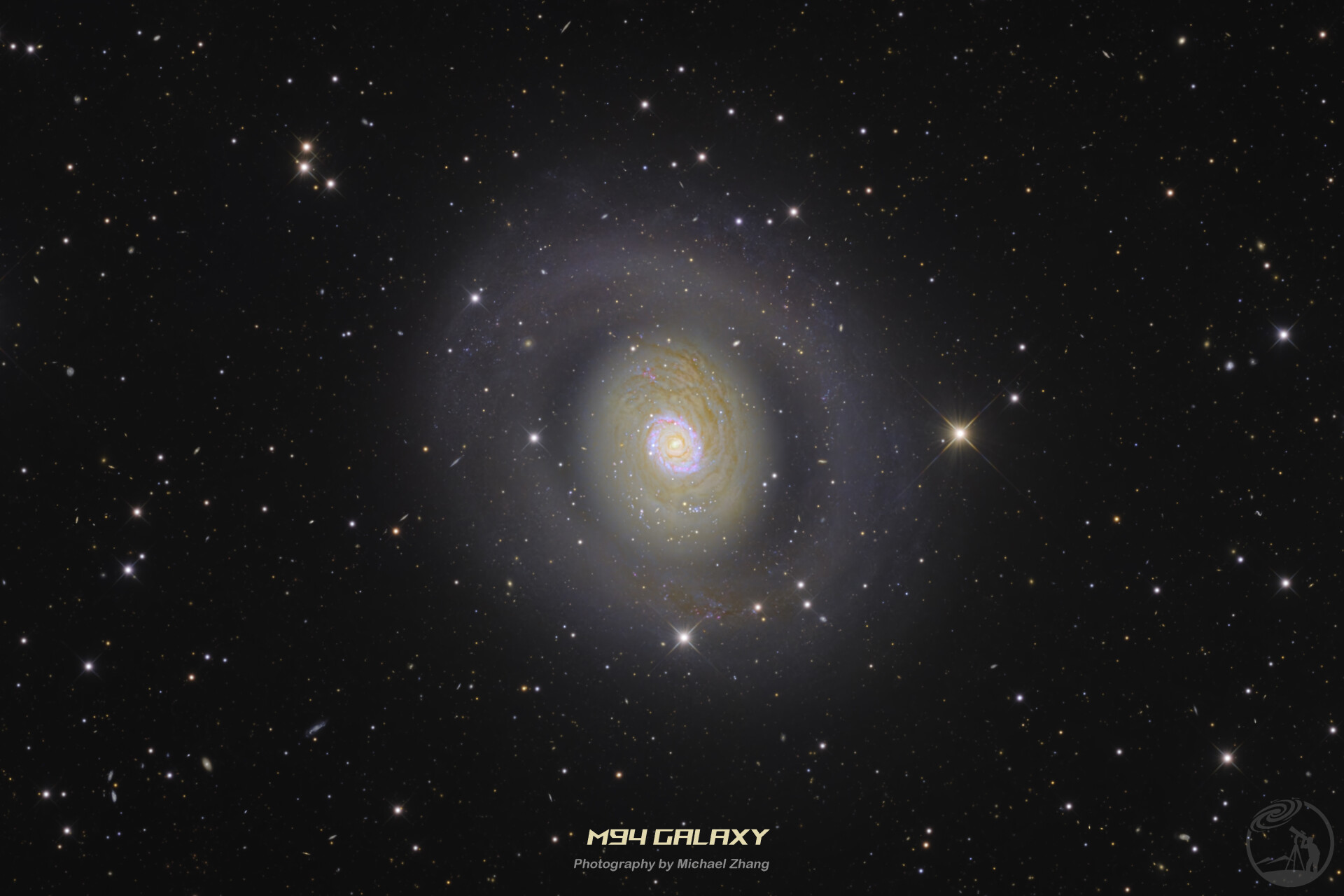 M94(NGC 4736)是位于猎犬座的漩涡星系,由法国天文学家皮埃尔·梅香于1781年发现,收录于梅西耶天体目录。该星系距离地球约1500万光年,直径约3万光年,属于星爆星系,其显著特征为明亮核区与紫外波段可见的双环结构。