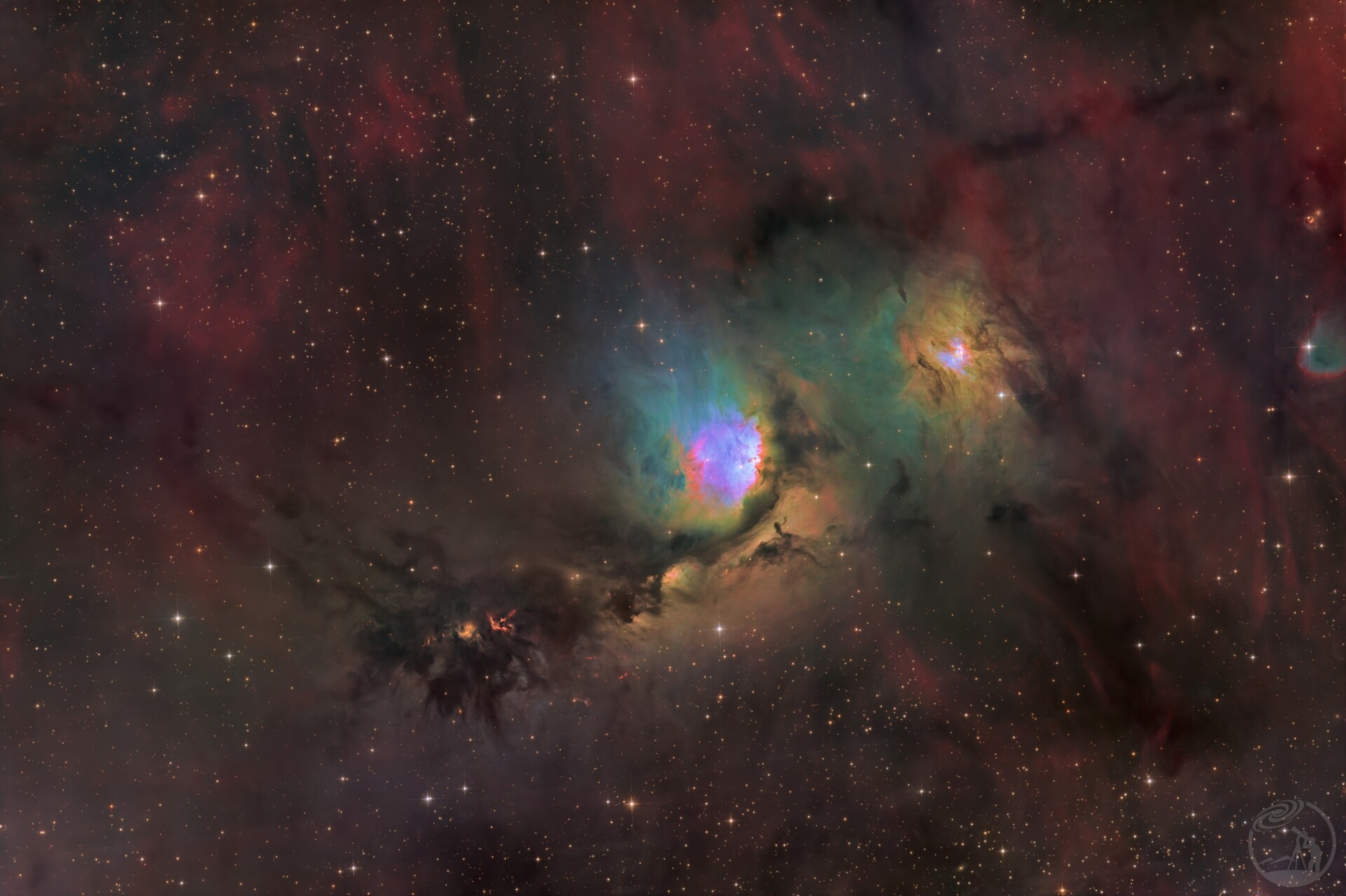 本作品展示了位于猎户座的M78星云(Messier 78),它是猎户座分子云复合体中最为明亮的反射星云区域,距离地球约1600光年。画面主体由两个主要的亮区构成,分别为左侧较亮的NGC 2068和右上方较暗的NGC 2071,它们被星际尘埃云所包围。