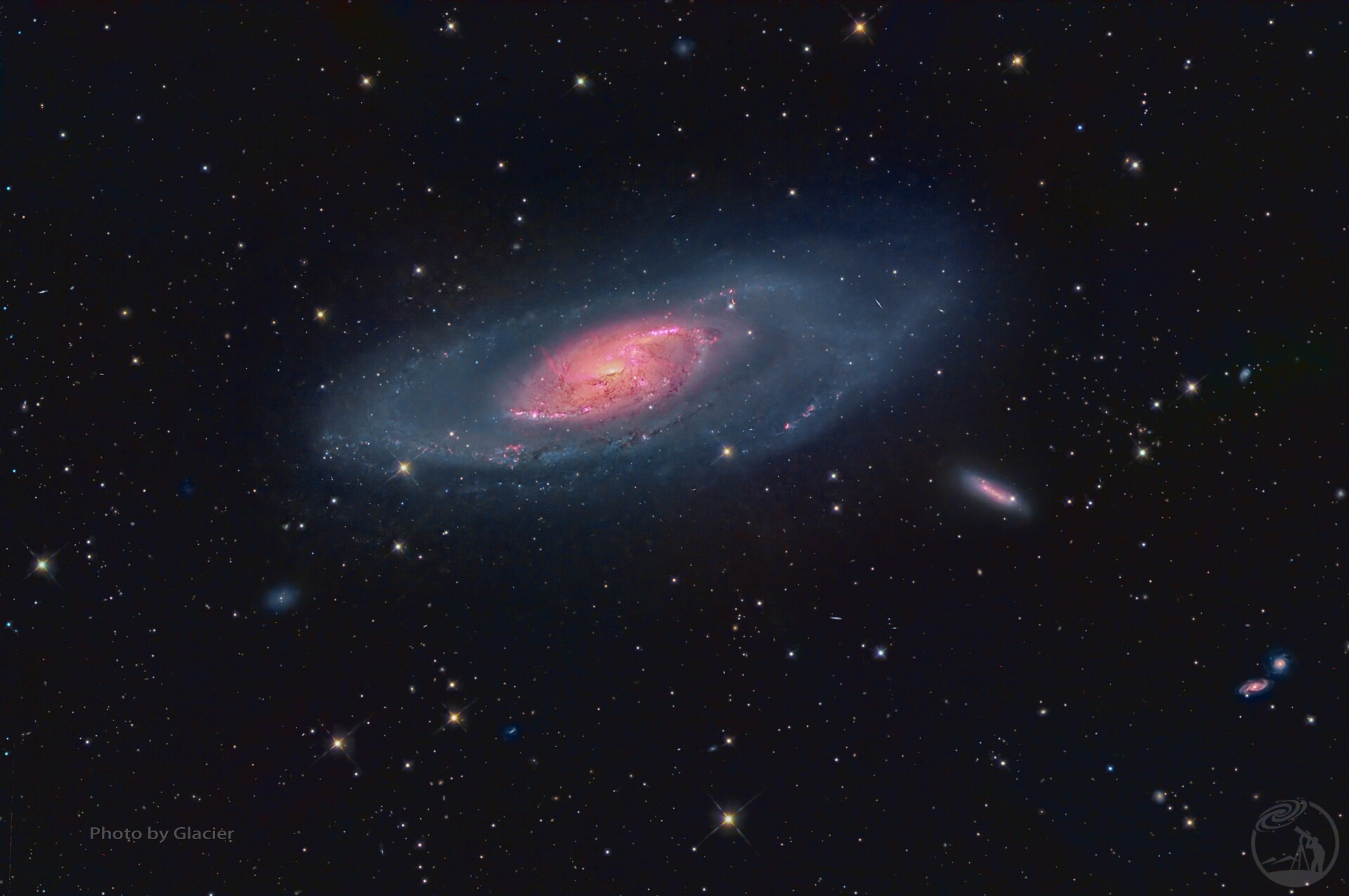 本作品呈现了位于猎犬座(Canes Venatici)的螺旋星系M106,其目录编号为NGC 4258。作为天文学中著名的塞弗特II型星系(Seyfert II galaxy),M106拥有一个活跃的星系核。在画面中,星系核心区域呈现出显著的红粉色辉光,这对应着高浓度的电离氢辐射(H-alpha),表明该区域存在剧烈的恒星形成活动或受中心黑洞吸积盘的影响。