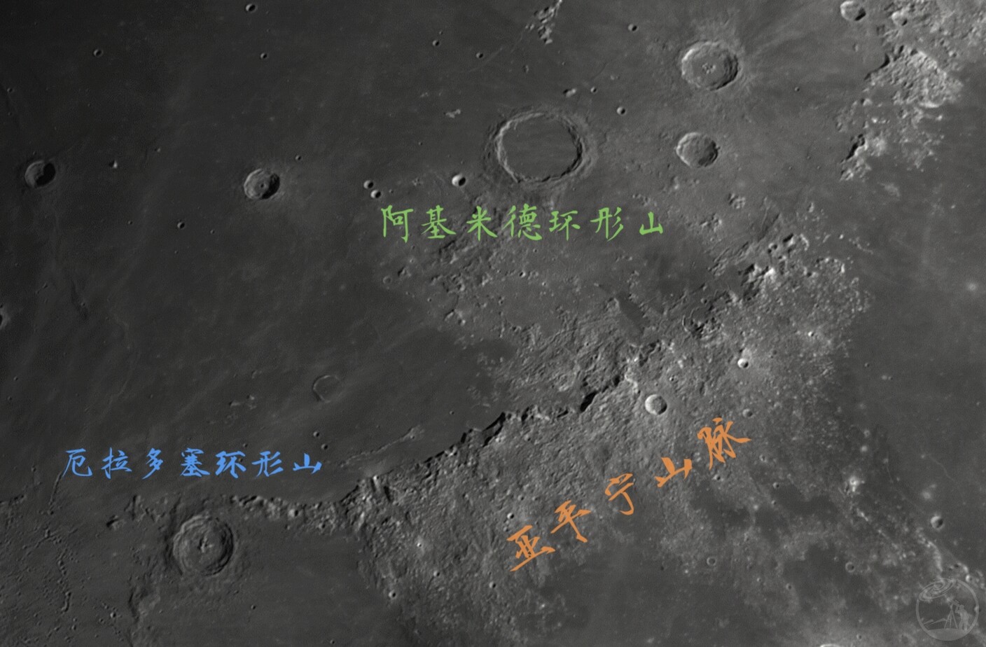 阿基米德环形山 (Archimedes) —— “完美的平底大坑”位于亚平宁山脉的正北侧,是识别山脉位置的最佳锚点。雨海边缘的一座大型古老撞击坑,直径约81公里。
