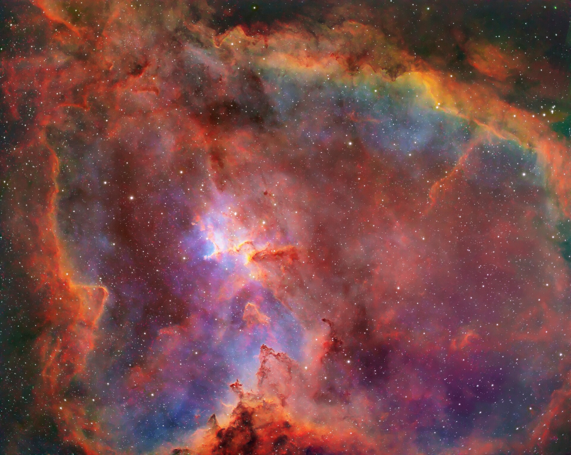 背景空间中密布着数量繁多的恒星,从微小的光点到较为明亮的星点,展示了该天区极高的恒星密度,符合银河系旋臂方向的富星场特征。整幅图像客观地记录了电离氢气云、散射光尘埃云以及暗物质在空间中的分布形态,展现了恒星形成活跃区的典型物理景观。