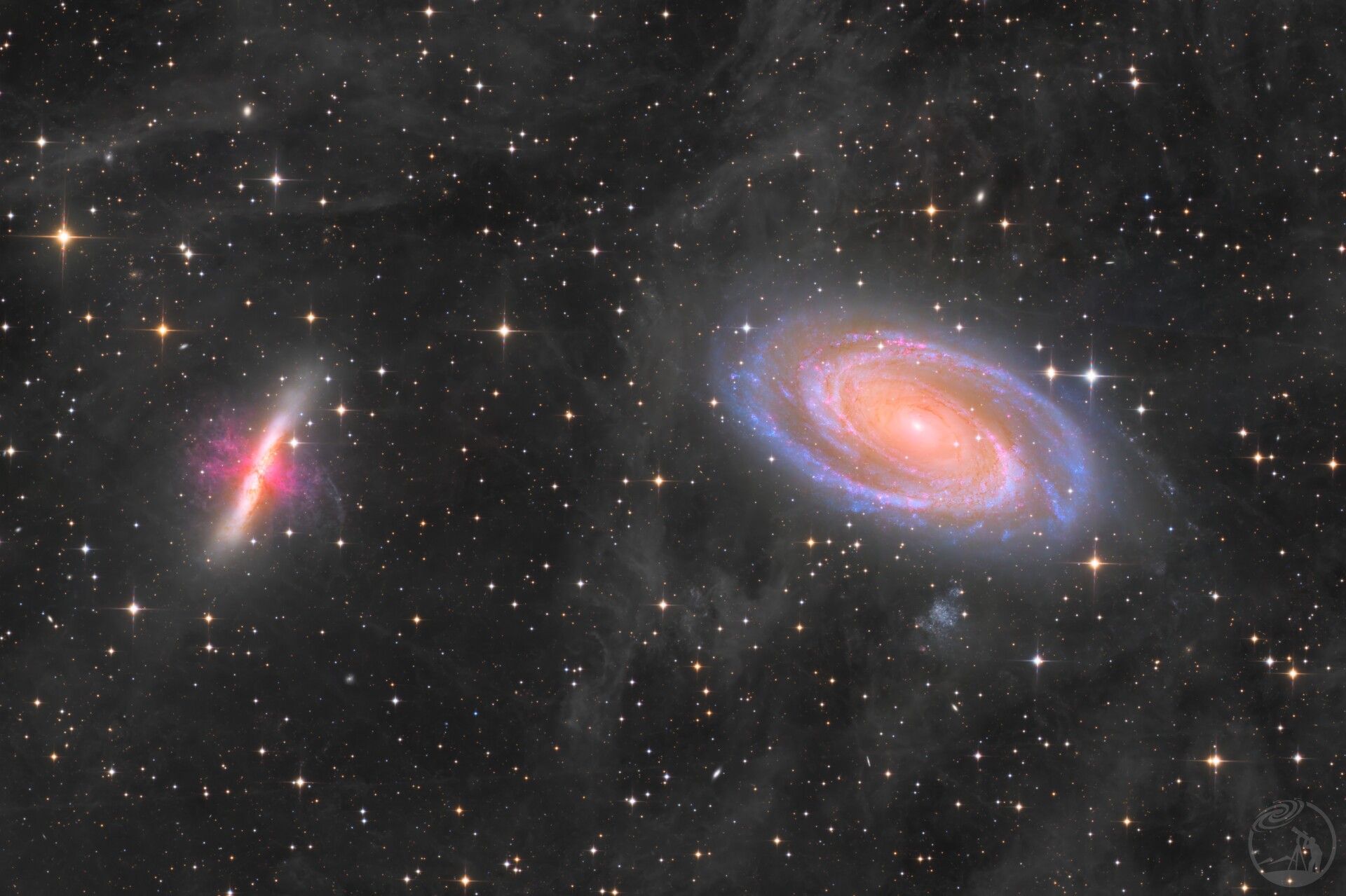 本作品呈现了位于大熊座方向的著名双星系系统——M81(草书星系)与其相互作用伴星系M82(雪茄星系)的近距离天文影像。