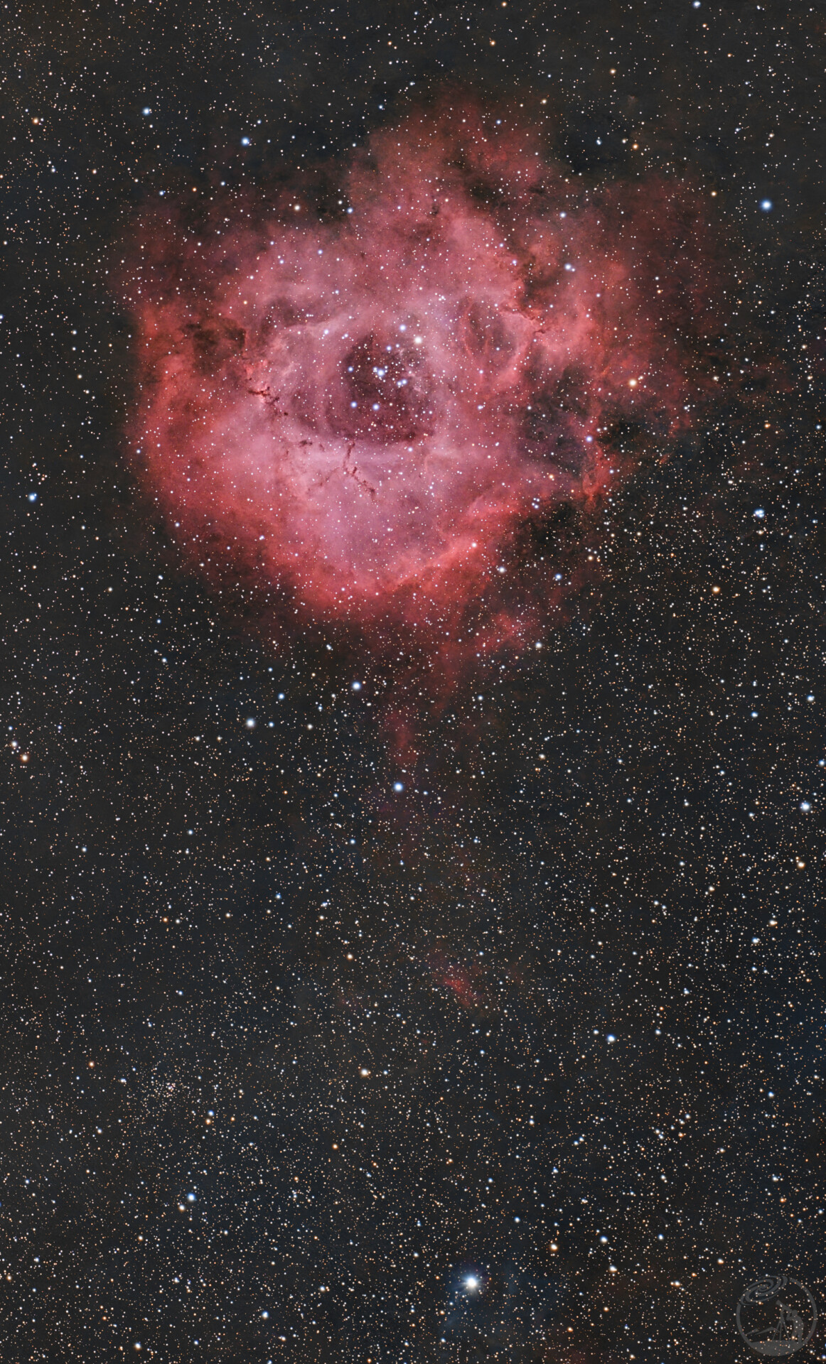 NGC 2237,即广为人知的玫瑰星云,位于麒麟座方向,是这幅图像的主体天体。这是一个巨大的电离氢区(H II区),主要由富含氢气的气体云和嵌入其中的年轻大质量恒星组成。