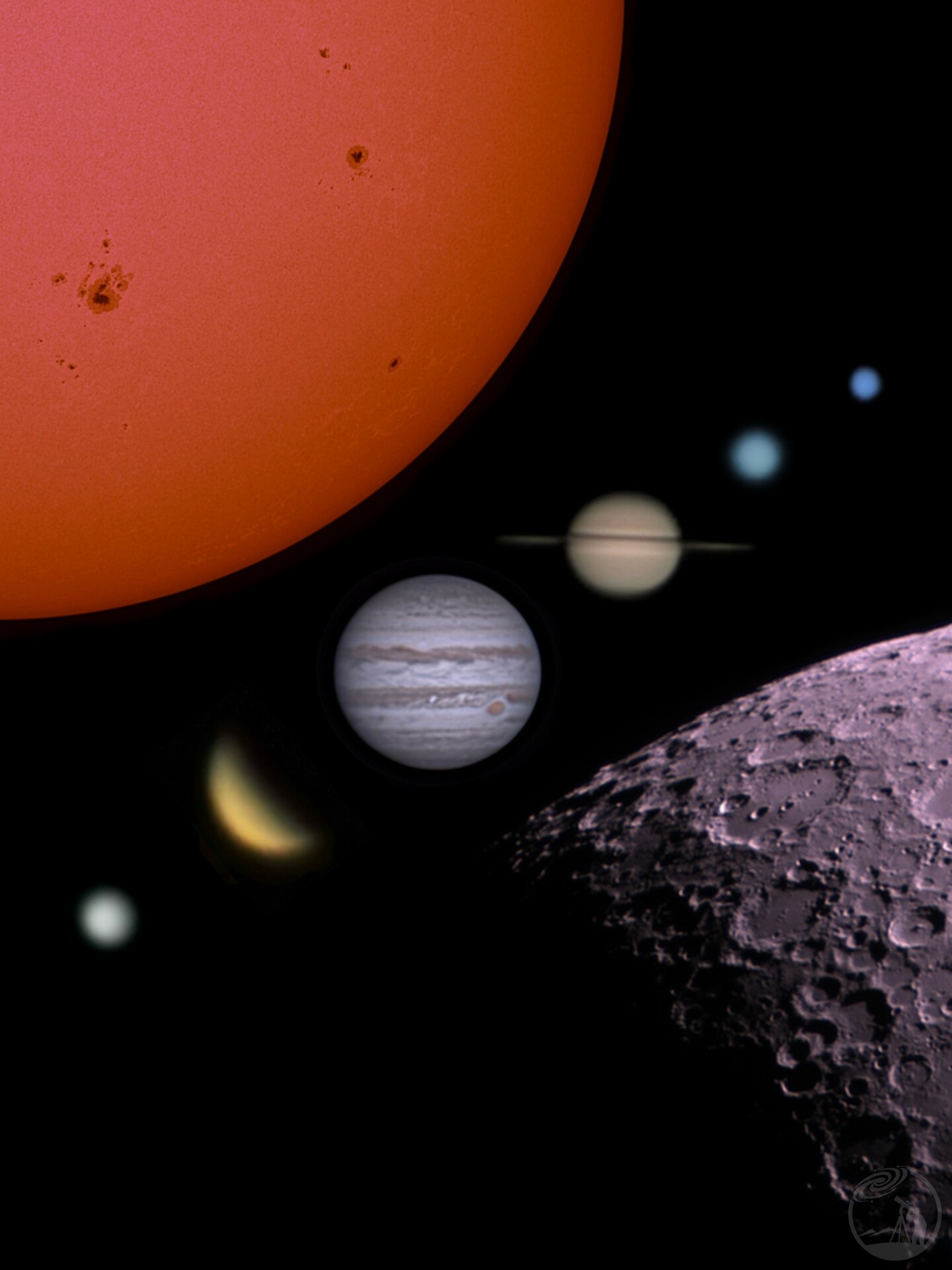 不是同一个夜晚,也不是同一片天区,但把它们拼在一起,就成了我自己的太阳系全家福。太阳是用赫歇尔棱镜拍下的橙红色光球层,月亮是上弦月。水星低低地贴在地平线的暮光里,金星亮得像一颗小焊弧,木星带着大红斑和两条主云带沉稳地定在画面中央,土星的光环几乎水平,天王星是一颗淡青色的小圆面,海王星则是更冷的深蓝——唯独缺了火星,它此刻正躲在太阳背后,不肯赴约。有人说全家福少一个人就不算完整,但我觉得,留一个位置给明年的冲日,反而多了一份念想。