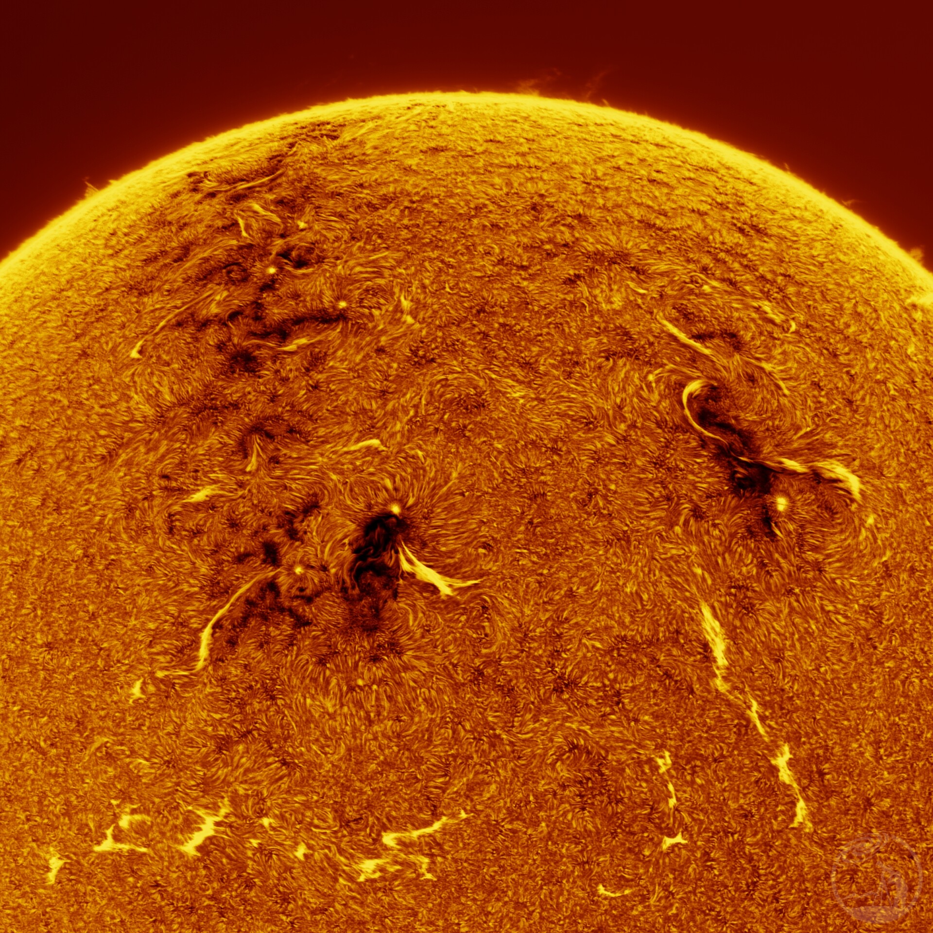 日面相当丰富,大片黑子群还在,甚至在中间偏右又爆发了一个小耀斑。左上角有一块日珥已经离开了日面。