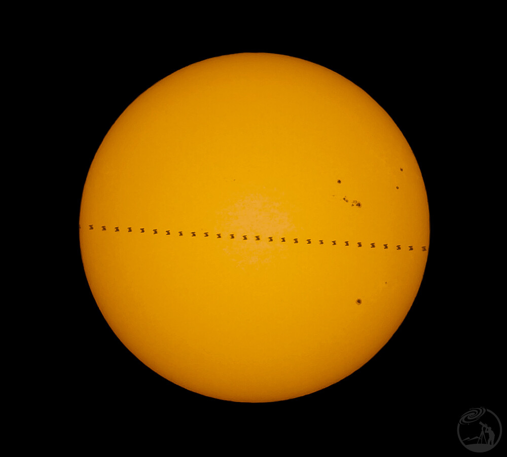 这组图像记录了国际空间站(ISS)凌日的天文现象。画面中心为占据绝大部分视野的太阳圆面。在上方图像中,太阳呈现出浓郁且均匀的橙黄色,表面可见细微的光球层纹理。横跨太阳中部有一条清晰的、呈线性排列的黑色剪影序列,这是国际空间站在高速公转过程中掠过日面留下的轨迹,影像单元保持着规则的间隔。太阳表面分布着几处暗黑色的太阳黑子,其中一组较为复杂的黑子群位于右上象限,由多个大小不一的斑点聚集而成,另有一个较小的孤立黑子位于右下象限。
