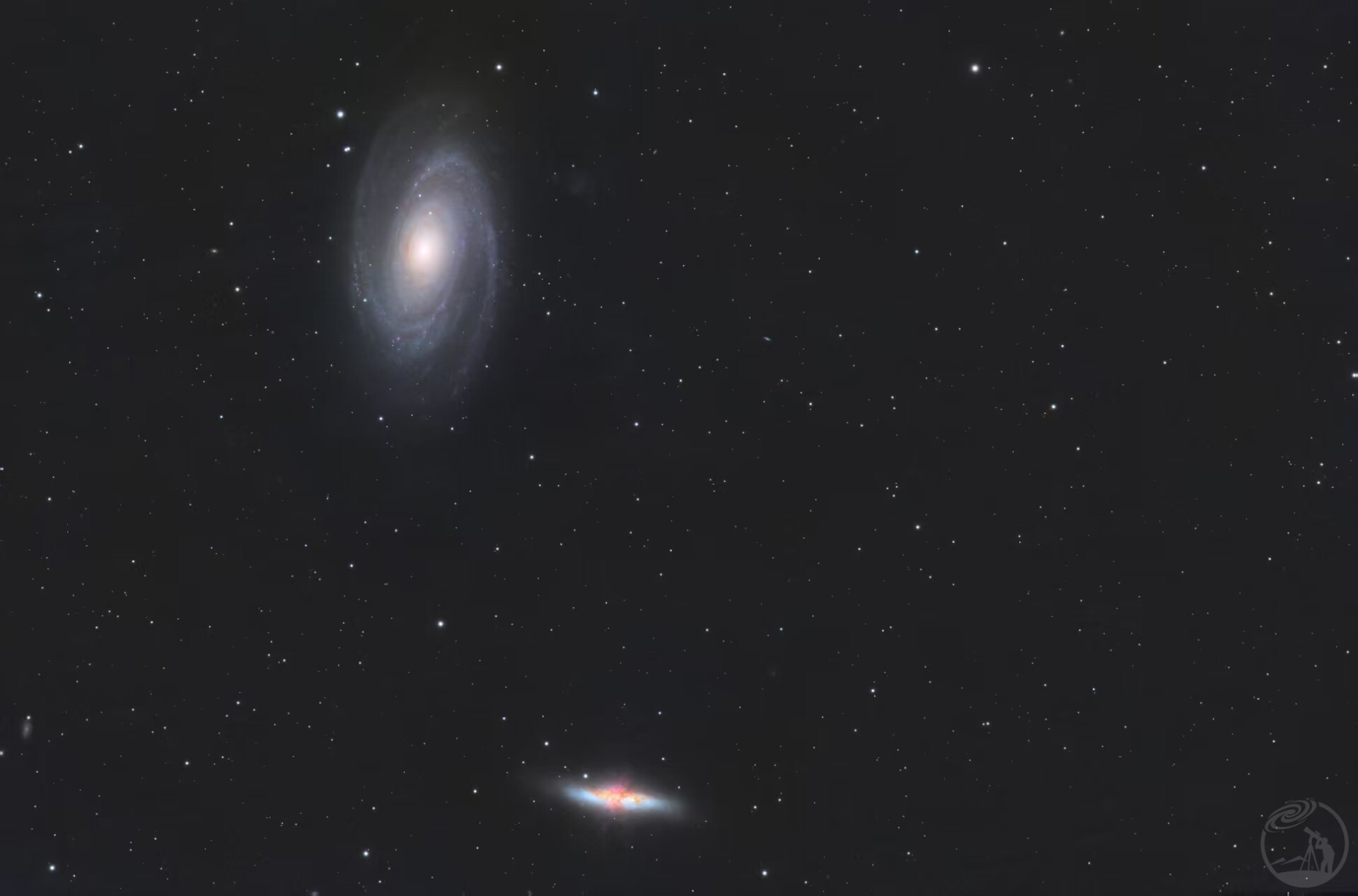 画面下方偏中位置展示了M82(雪茄星系)。该星系以侧面视角呈现,整体形态呈细长的透镜状或雪茄状。其中心区域呈现出显著的红色至橙色光晕,这是典型的星暴星系特征,表明该区域正在进行剧烈的恒星形成活动。星系盘面在红光中心之外延伸出微弱的蓝白色结构,边缘略显弥散。背景深邃的黑色空间中密布着众多背景恒星,它们的亮度和色温各异,为这两个主要天体提供了良好的空间参照。整幅画面中,M81的规则几何形态与M82受引力扰动后的不规则形态形成了鲜明的视觉对比。