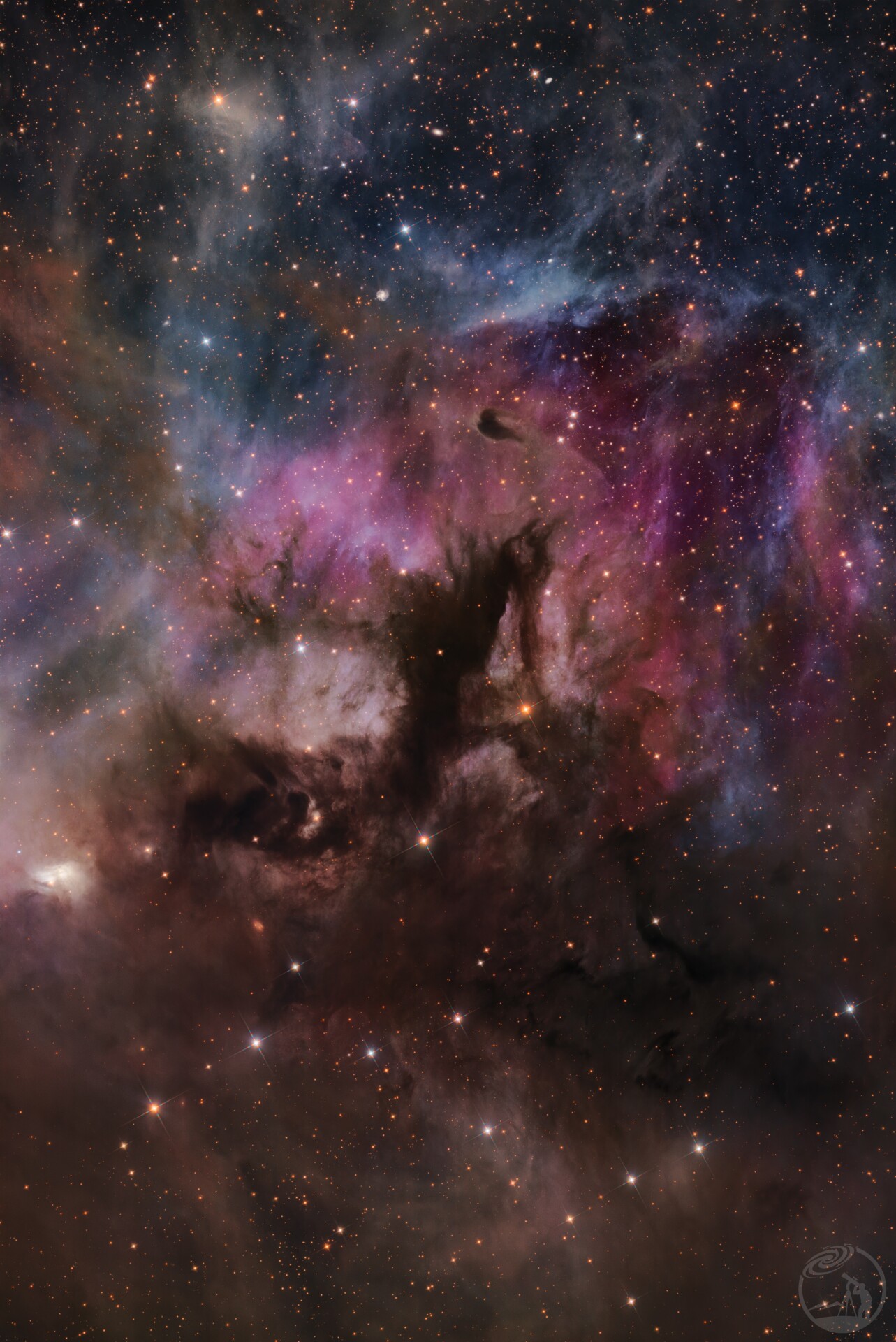虽然它本身是遮挡背景光线的暗星云,但其内部有一颗明亮恒星(HD 278942),其星风清空了周围的尘埃,形成了一个发光的“花环”结构。这片区域也是银河系内的一个活跃的恒星孕育场。
