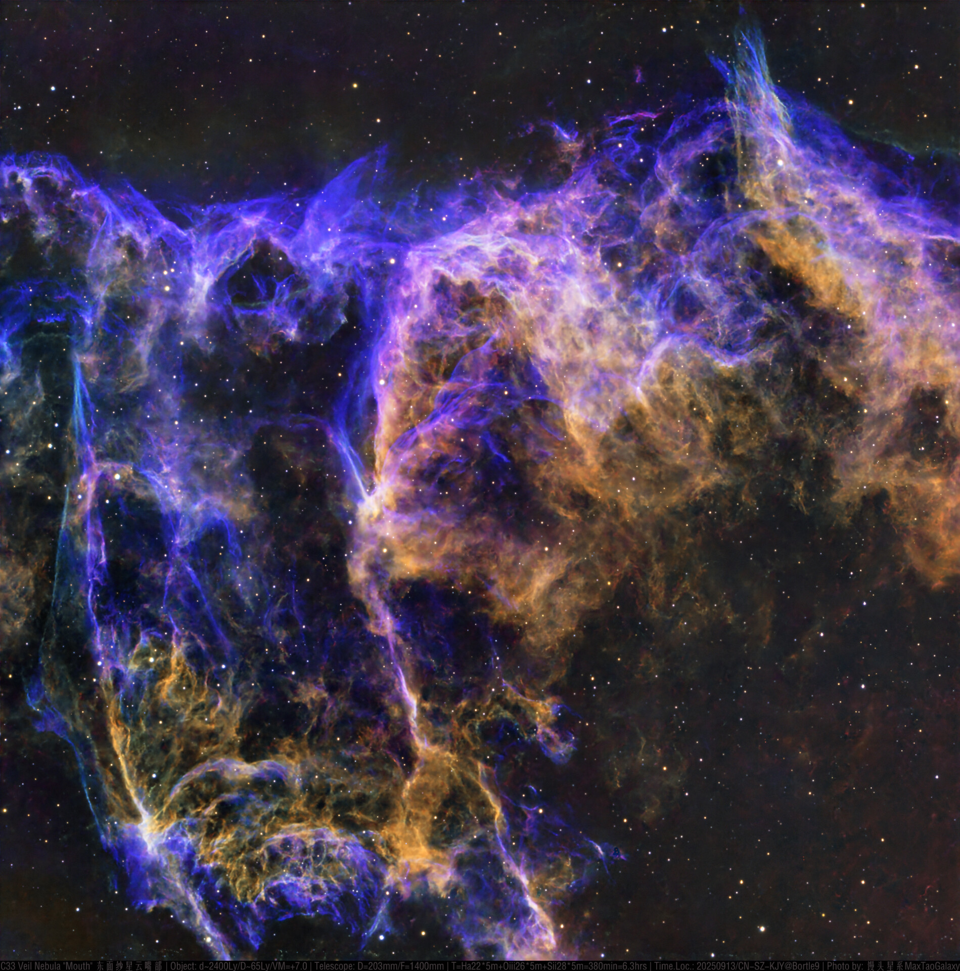 C33 Veil Nebula "Mouth" 东面纱星云嘴部 | Object: d~2400Ly/D~65Ly/VM=+7.0 | Telescope: D=203mm/F=1400mm | T=Ha22*5m+Oiii26*5m+Sii28*5m=380min=6.3hrs | Time.Loc.: 20250913/CN-SZ-KJY@Bortle9 | Photo by: 馒头星系MaxTaoGalaxy
