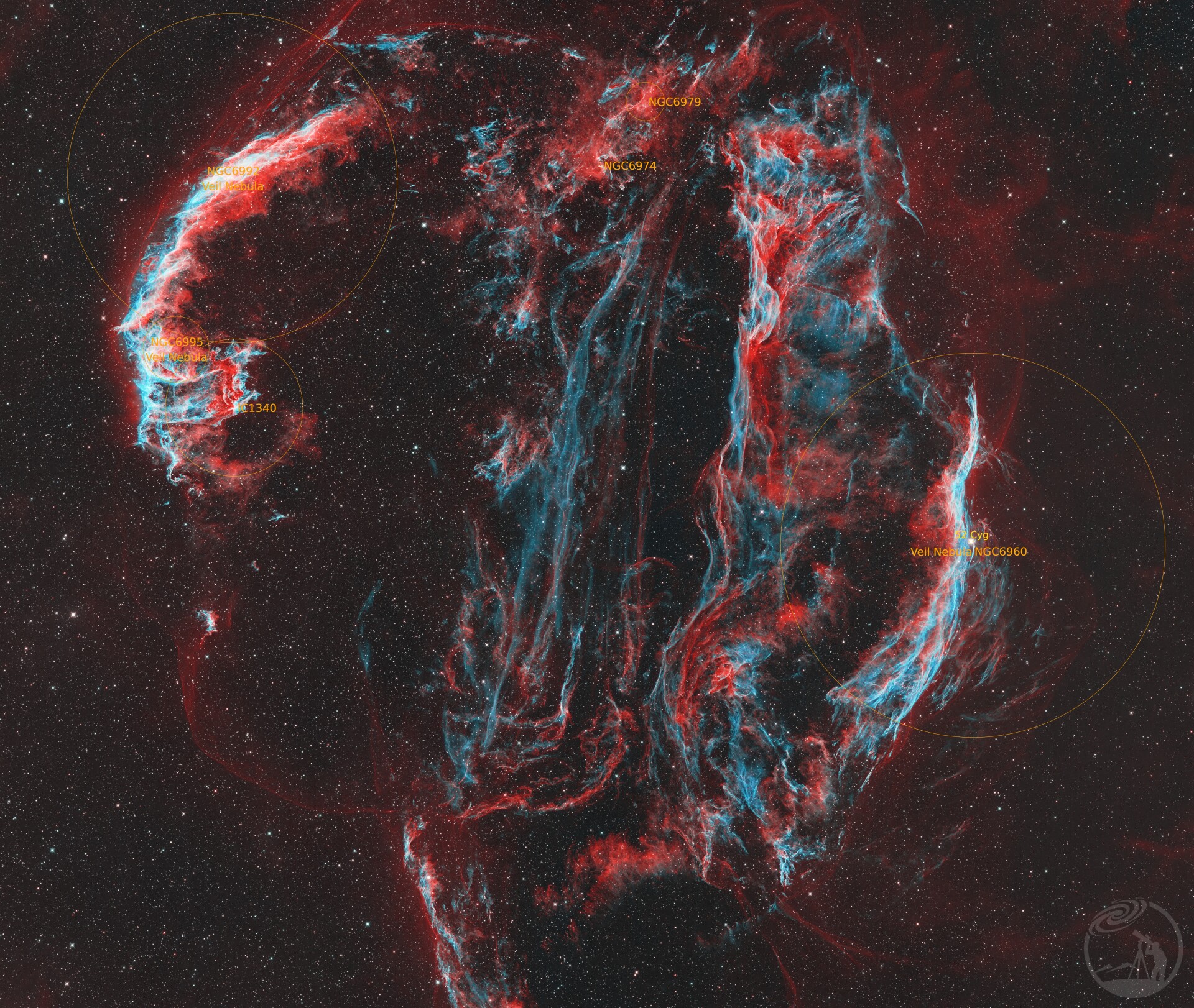 天鹅座环包含东面纱星云(NGC6992、NGC6995、和IC1340)、西面纱星云(NGC6960,又叫女巫的扫帚)和皮克林的三角(NGC6974和NGC6979)三个主体部分组成。天鹅座环是一个离我们大概2500光年,爆炸时间在1-2万年内的超新星遗迹,占据一个3度左右的直径。