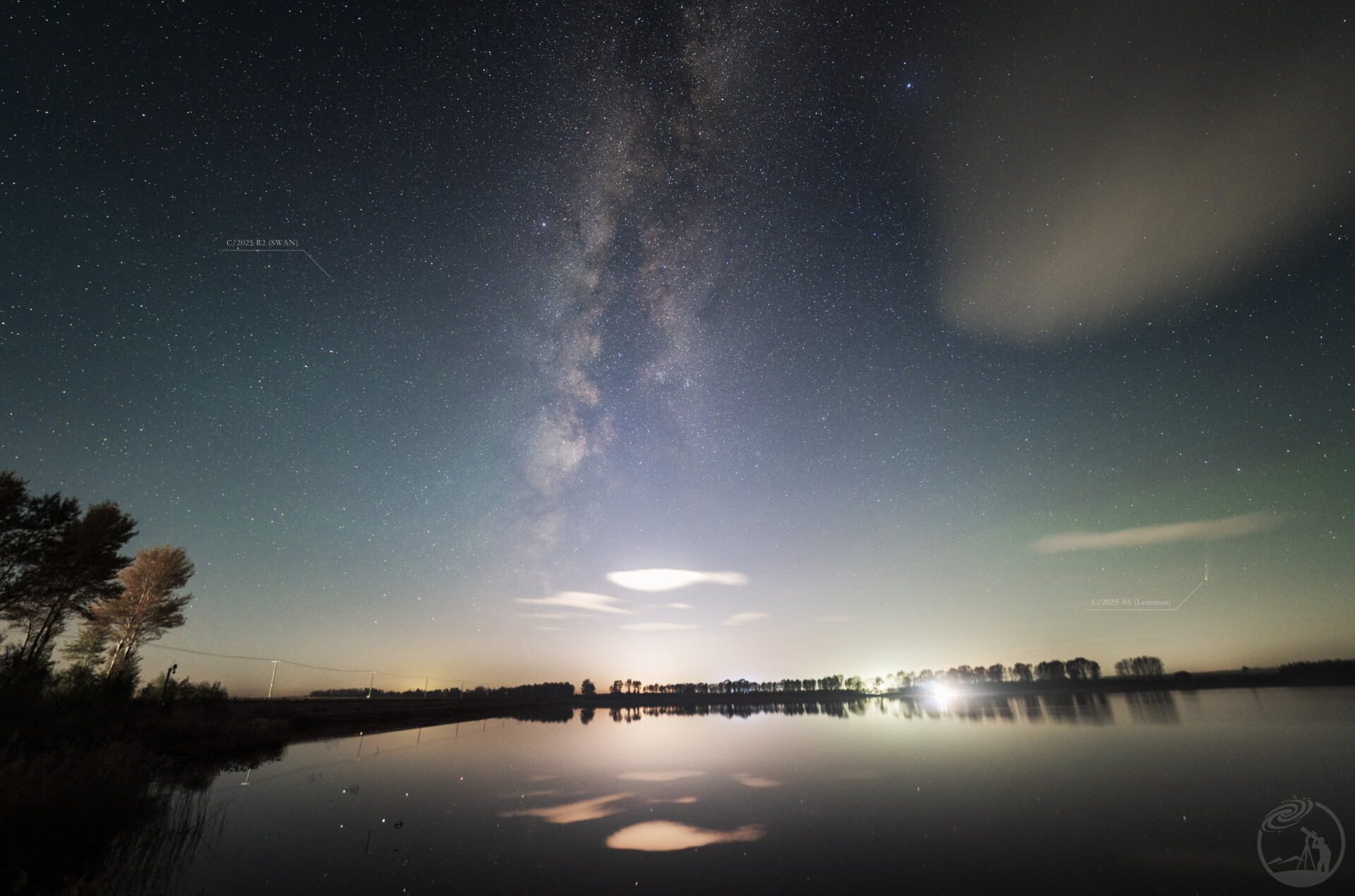 2025年10月末,关注已久的C/2025 A6(Lemmon)莱蒙彗星与C/2025 R2(SWAN)天鹅彗星双双达到了亮度峰值,观测条件极佳。25日下午,我和朋友驱车来到吉林省双辽市八一湖景区,一起观测并拍摄这两颗彗星。天文昏影结束后,明亮的银河斜挂于天际,两颗彗星一左一右隔着星河相互凝望。繁星、银河与彗星倒映在平静的湖面上,淡绿的气辉为夜空染上了一丝黯淡的色彩,构成一幅绝美的画面。美中不足的是,当天晚上天气并不是很好,在拍摄的过程中,一团巨大的云彩遮蔽了画面右上角的天空。此时又正值秋收,焚烧秸秆产生的烟雾与湖面的水汽混合,在近地面形成一层薄薄的雾霾,影响拍摄效果。银河底部正对双辽市区方向,灯光影响大。虽然有些许遗憾,但这样的追彗记忆仍令我印象深刻。声明:本图为借用朋友的备用相机和镜头拍摄,朋友似乎没有寻星客账号,故暂时无法列进拍摄者名单。在其它平台发布的时候本图会在我个人的水印旁边加入朋友的水印。