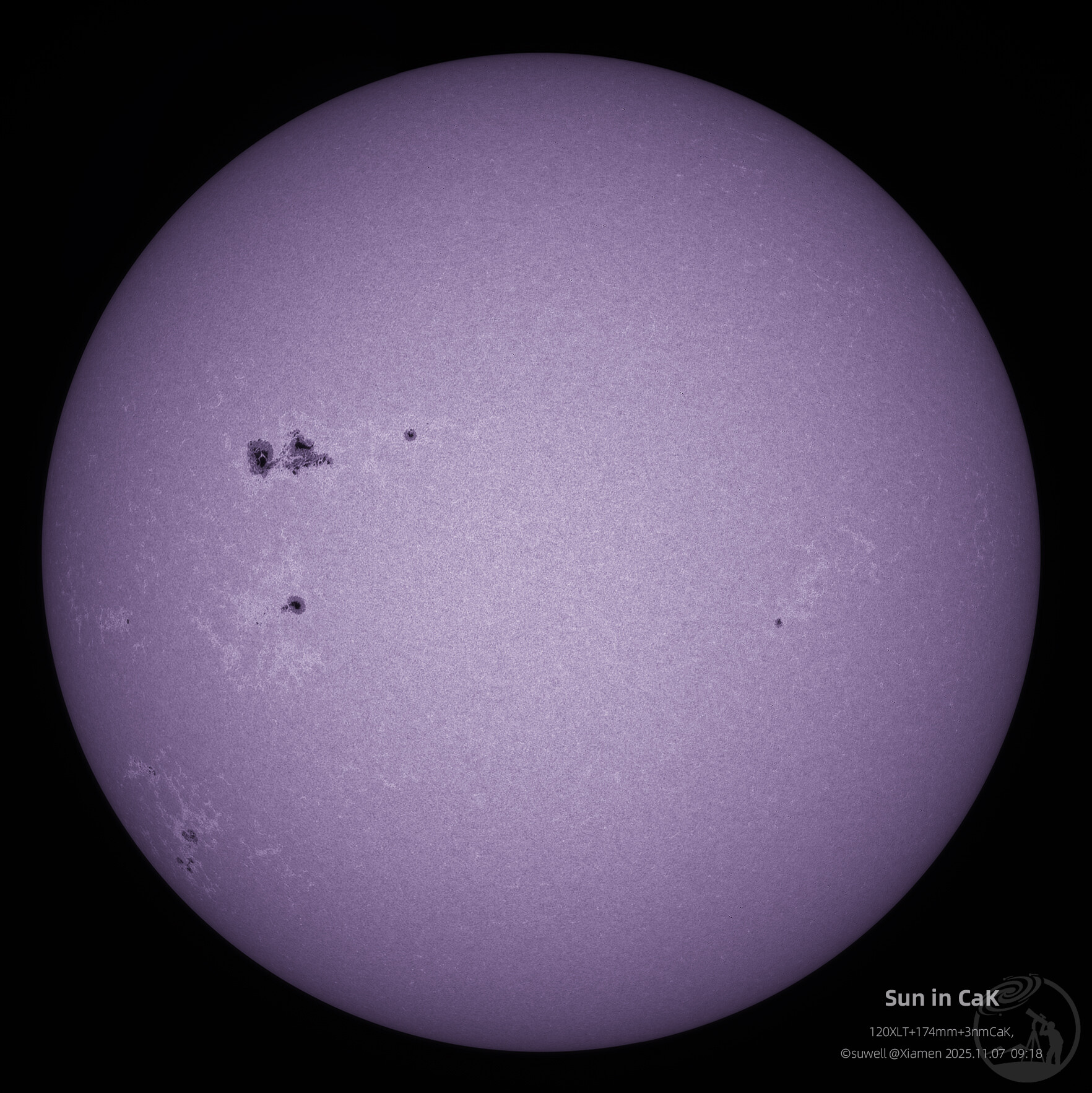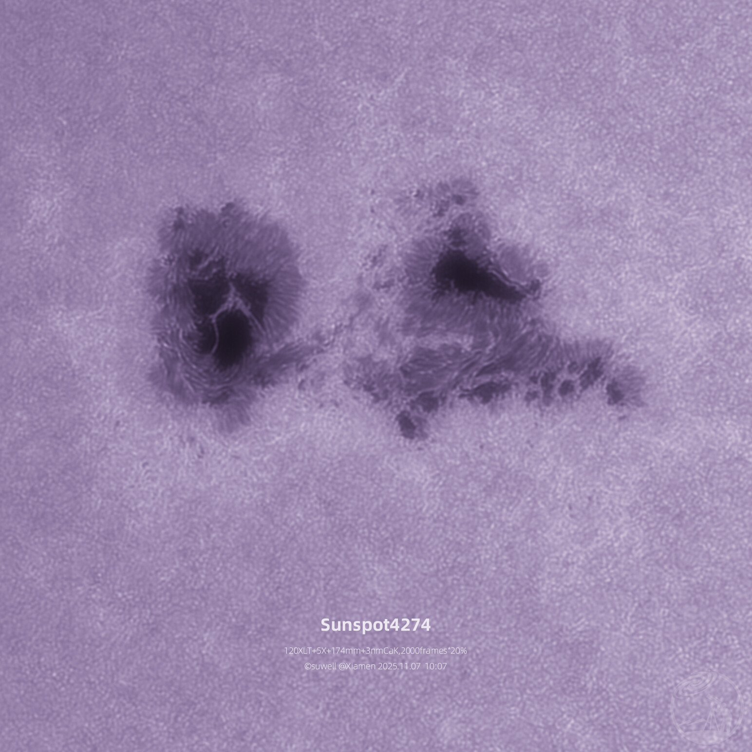 天气还行,5000mm焦距拍个特写,昨天飞机凌日经过这个黑子群看到它结构挺混乱的,果然今天就看到新闻说该区域耀斑爆发。图二是4274及4275、图三为全日面。