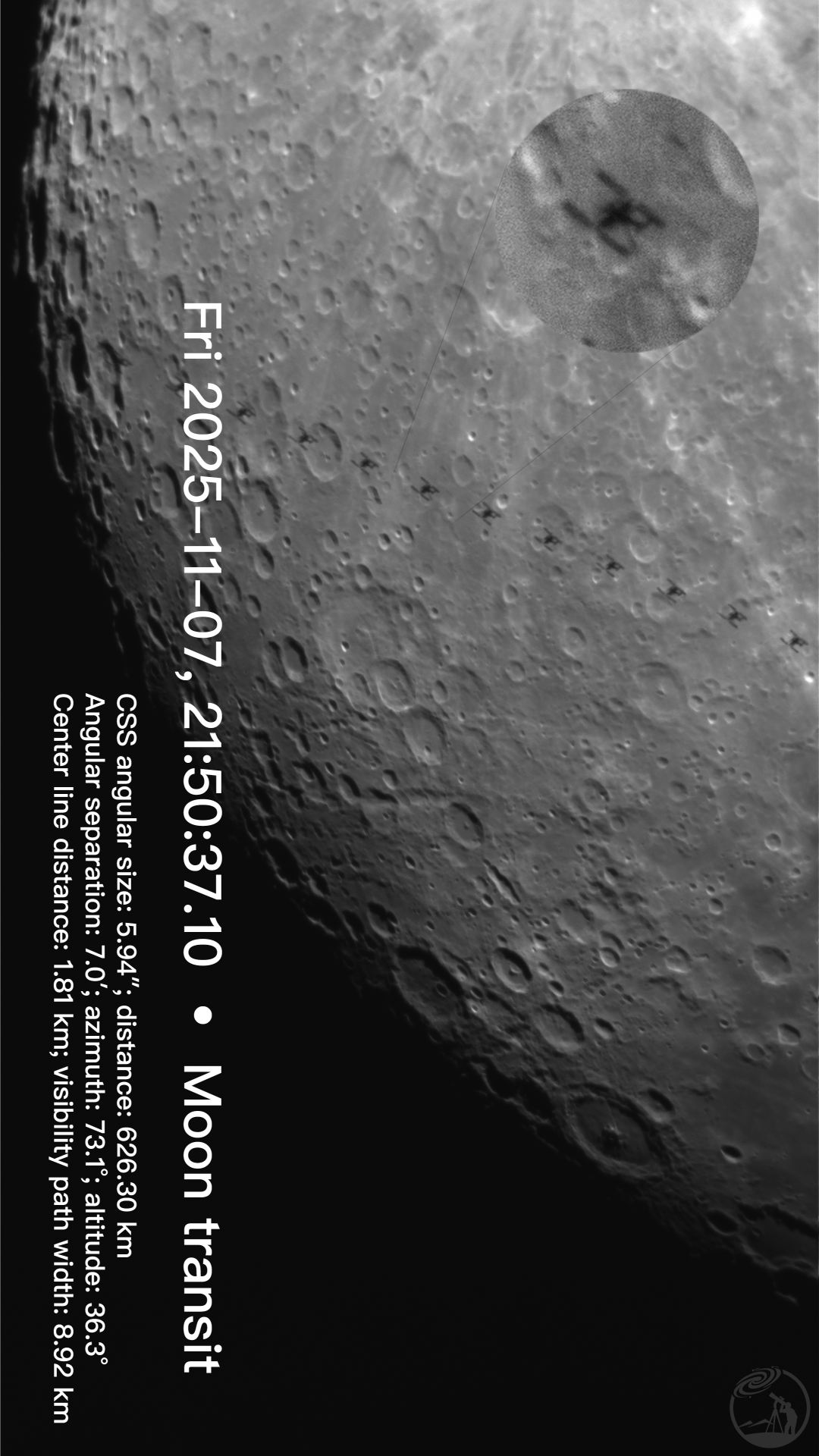 这次虽然高度角只有36度,空间站个头也只有18角秒,单好在天气算还不错,简单记录下。 精选 拍摄地点: 福建省厦门市集美区银江路137号 厦门 镜头/望远镜: c8 相机: 585mm 赤道仪: am5 评 论 星友评论