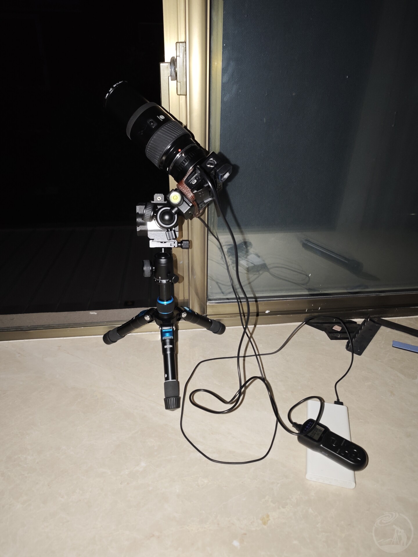 相机是索尼的a6000(没改机),镜头是300块钱的美能达100-300apo,赤道仪是nanolight星野赤道仪,再加上一个桌面三脚架,一个快门线,一个充电宝,在家里朝南的窗台上拍摄的,只能盲对极轴,为了不脱线所以单张曝光时间也就10秒,iso1600,家这边光污染7.6级,出来的效果我也感觉可以接受了。