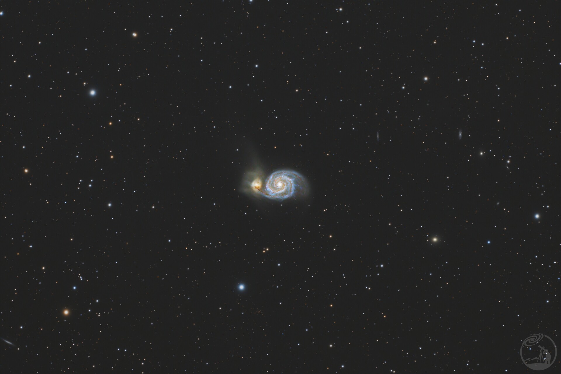 M51漩涡星又名涡状星系,位于猎犬座,人类确认的首个“旋涡星系”。距离地球约2300万光年,直径约7.6万光年,视星等约8.4等,属于哈勃分类中的Sc型螺旋星系。