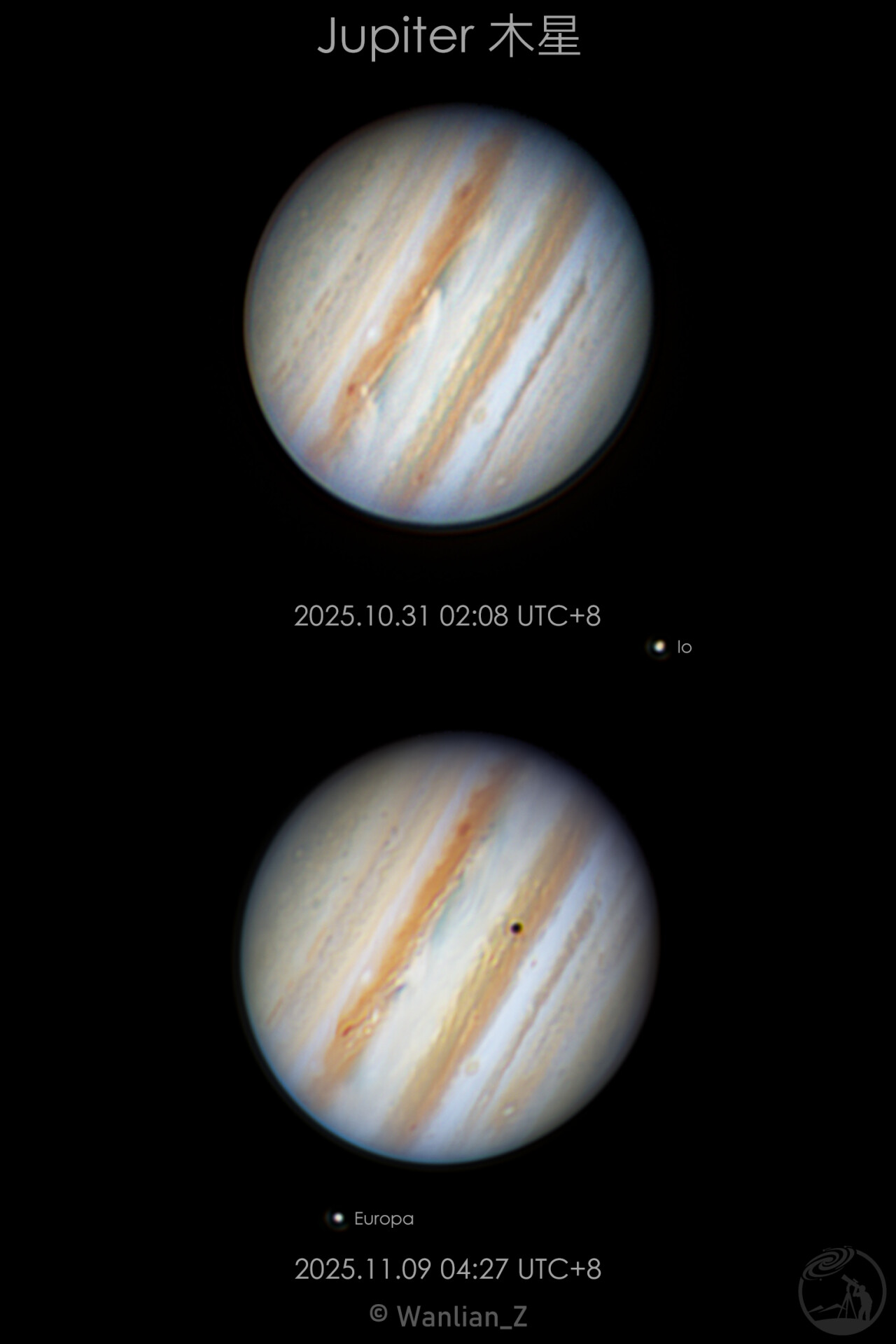 刚好十天内两次观测木星都在同一处朝向,可以见到赤道云带和中纬度深色云带细节有所变化 精选 拍摄地点: 广东省深圳市福田区金田路1020号 深圳福田 镜头/望远镜: CELESTRON C8 相机: QHY MiniCam8M 赤道仪: 布偶猫20 Super 评 论 星友评论