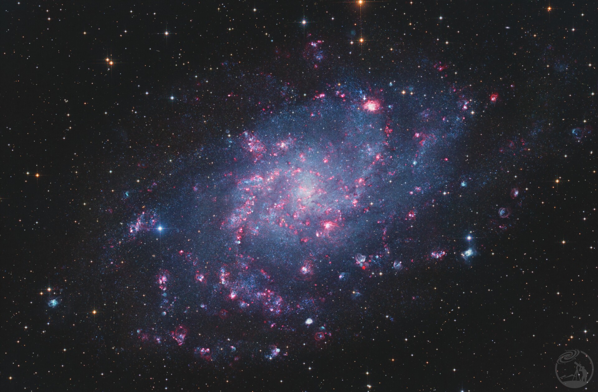 突发奇想做个HOO版的M33解构+星场。相比于LRGBHO,HOO的小红花小蓝花更壮观。去星降噪,极大程度地保留了星点的锐度,呈现了星场的视觉效果。图一减连续谱HOO,图二正常HOO,似乎减了连续谱的结构更明显呢?可惜HO总曝光时间不长,信噪比差了点,大佬们可以挑战一下。