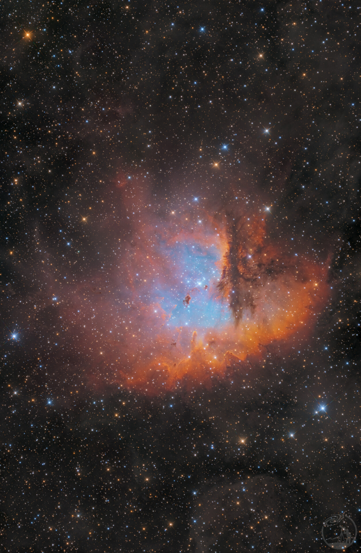 NGC 281 整体外形酷似 “吃豆人”。在窄带波段图像中,其氢原子辐射呈红色,氧原子辐射呈蓝色,还有黑色的尘埃带和云气柱,色彩丰富且对比鲜明。既然拍了lrgb,怎么能不把sho拍完呢