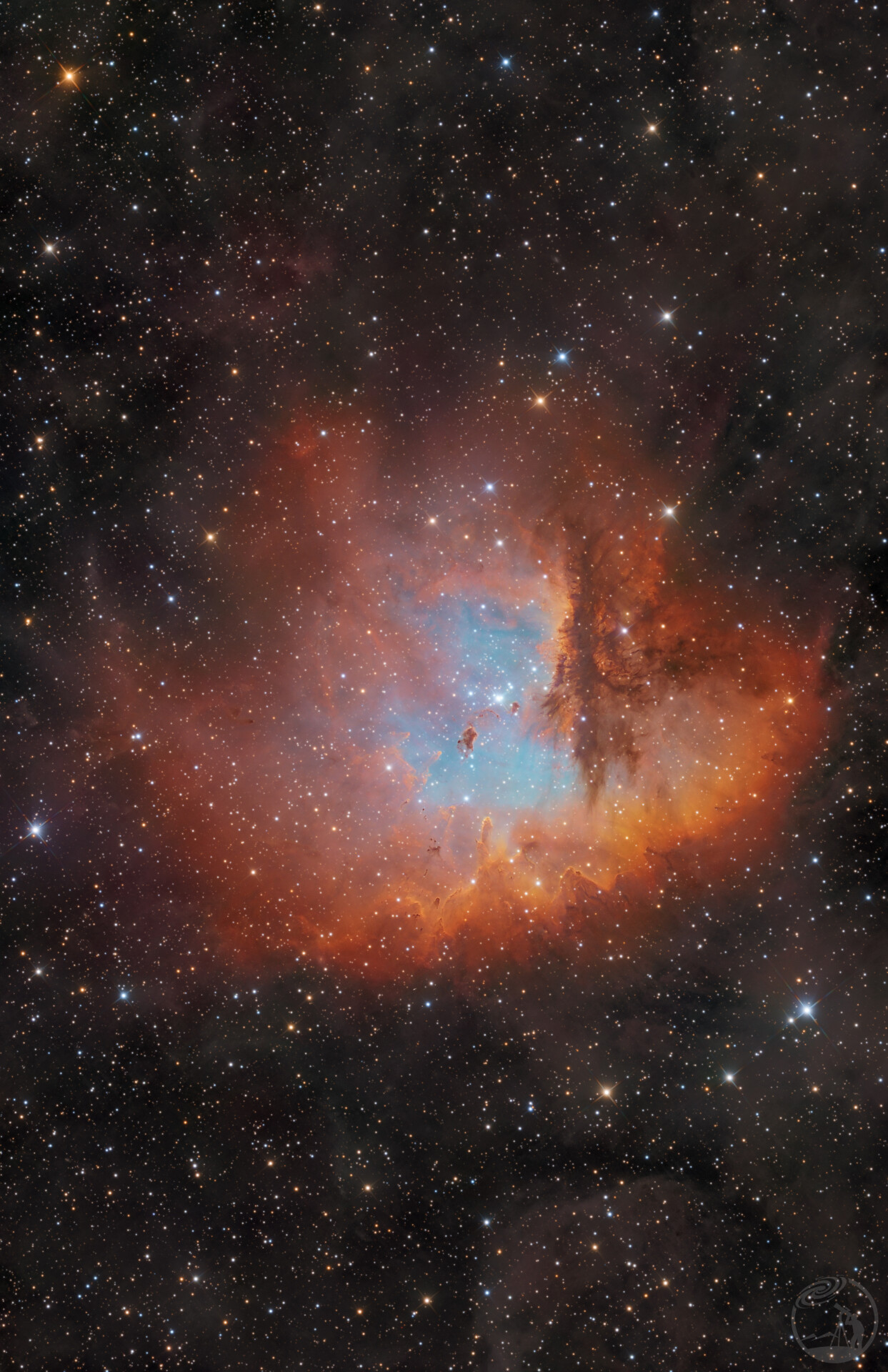 NGC 281 整体外形酷似 “吃豆人”。在窄带波段图像中,其氢原子辐射呈红色,氧原子辐射呈蓝色,还有黑色的尘埃带和云气柱,色彩丰富且对比鲜明。重新精修第二版。