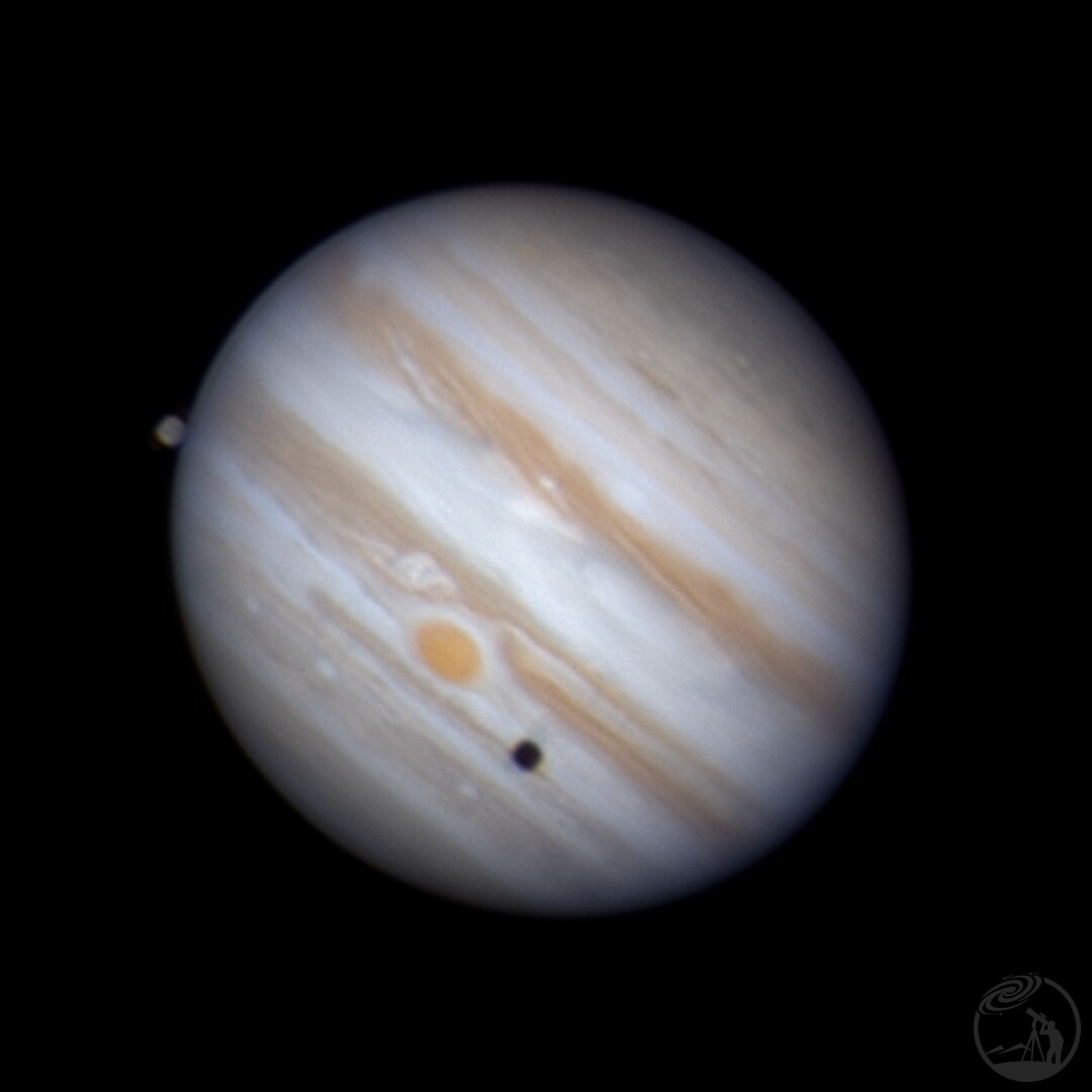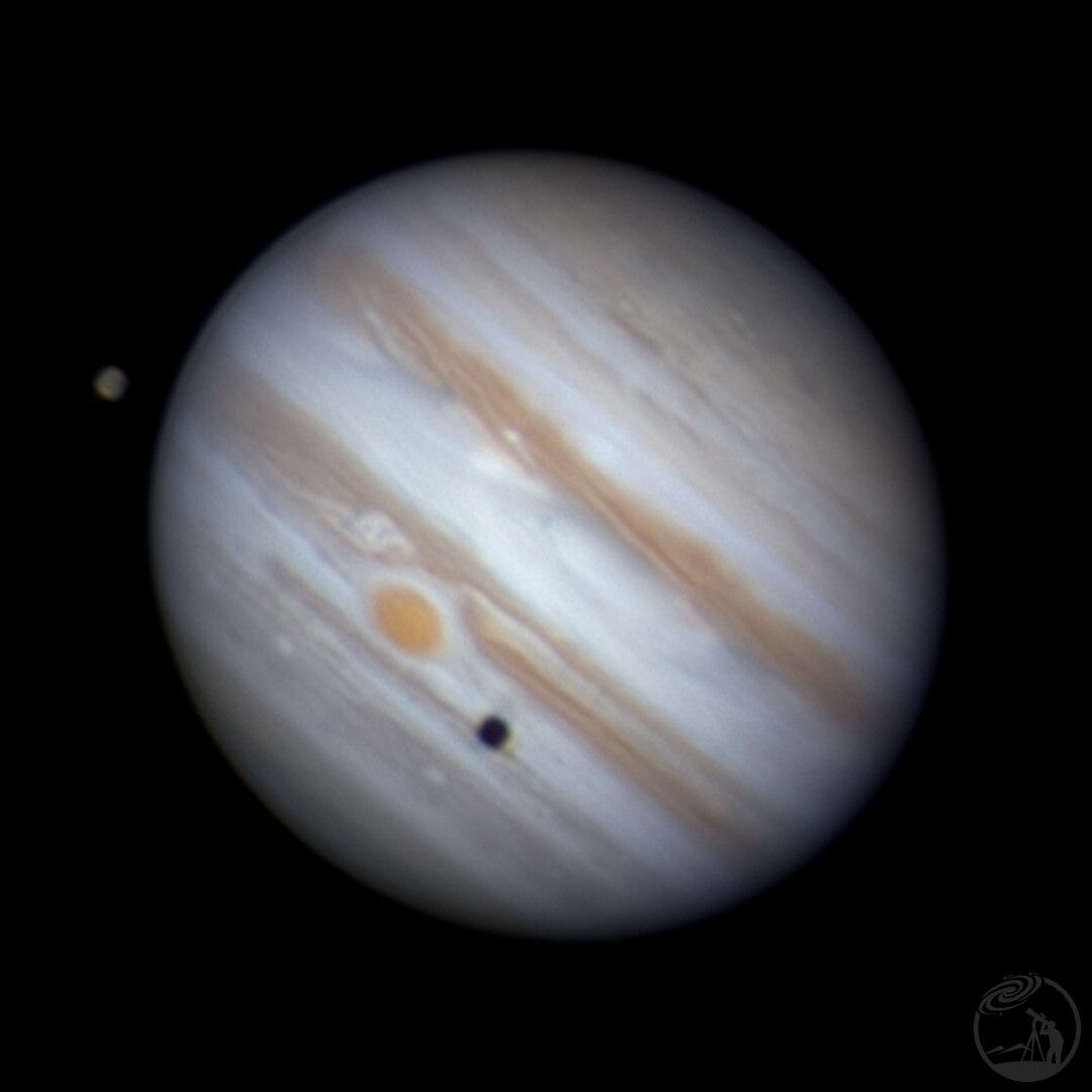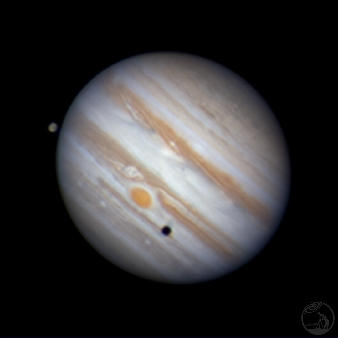 木卫三真的特别大,太阳系最大的卫星,直径5000多公里,它的影子仿佛在木星上留下了一颗黑痣,木卫三的影子显得非常巨大,它的影子比其他木卫投影更加震撼。在影子旁边刚好还有大红斑,比星球还大的风暴。不知道是光轴还是起露或者是视宁度问题?这几次的拍摄都不太满足,什么时候才能拍出真正的大片