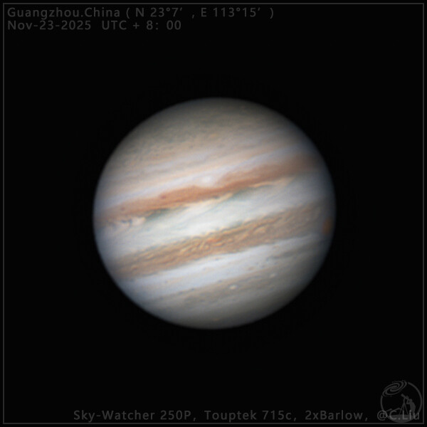 磨合老黑,真是一件苦差事,永远调不准的光轴,拍废了好几晚,最主要的是蹲视宁,进入11月,几波寒潮使得大气湍流猛烈,只能抓住宝贵的窗口期,拍下这张木星,虽然视宁并非极品,但也能使木星的细节纤毫必现,首次使用图谱715c去拍行星,色彩没有想象中的难调,不过几个通道的比例的确不太均衡,还有待琢磨