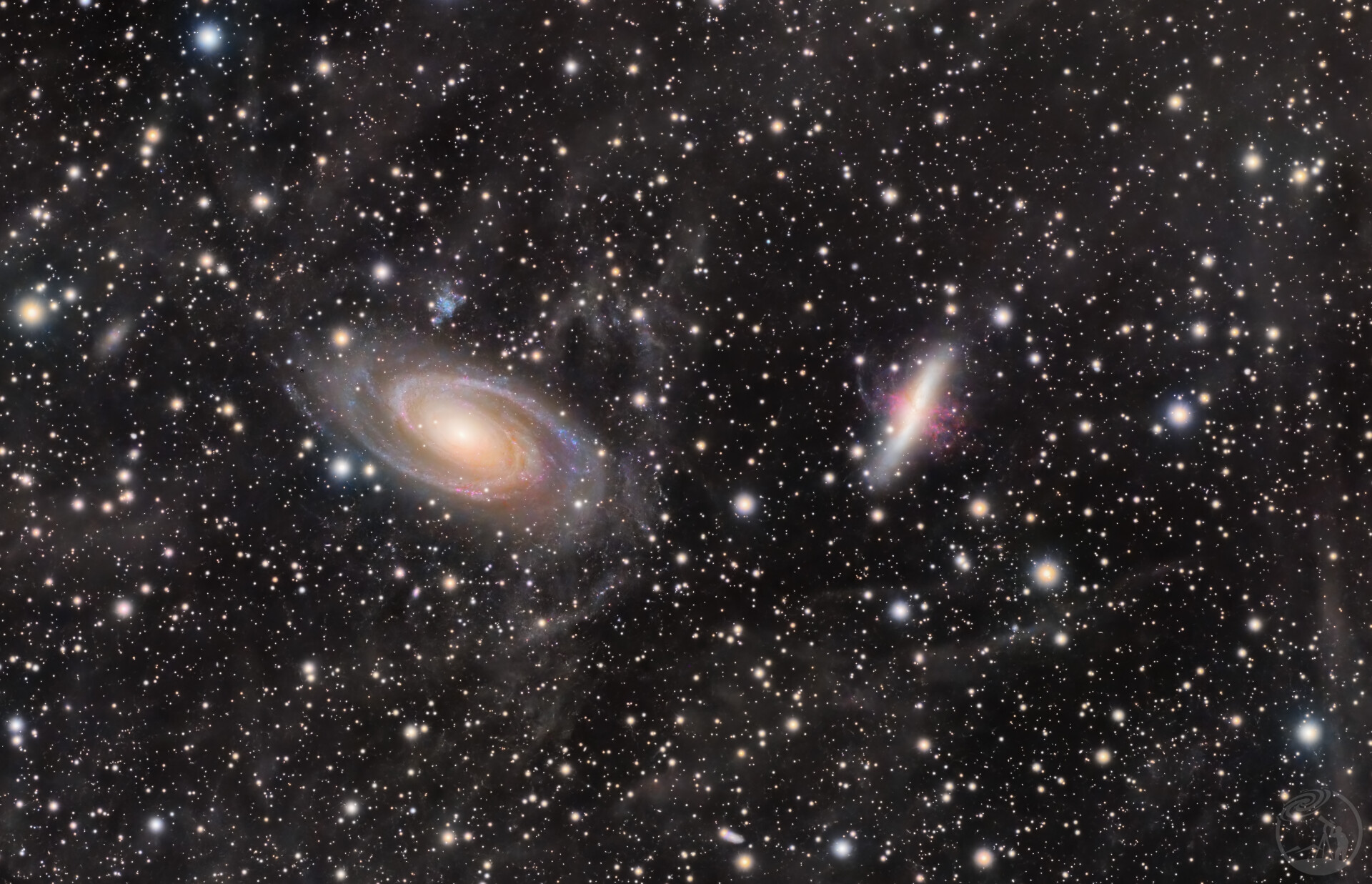 这俩CP很有意思,80口径焦距384拍摄,LRGB总计4,小时多,效果比想象中的好很多,暗云能拉出来一些。