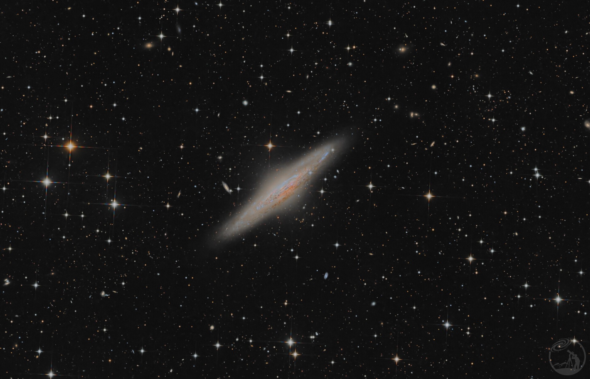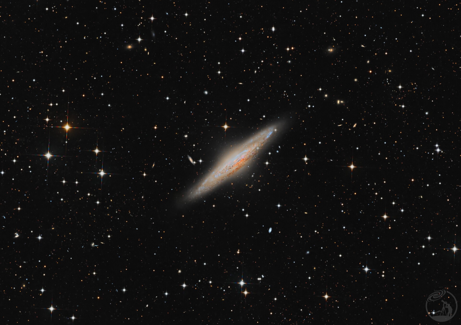 NGC 2683,又称“UFO星系”,是位于天猫座的一个螺旋星系,由威廉·赫歇尔于1788年发现。它因侧对着地球,其圆盘状形态酷似科幻中的飞碟而得名。该星系距离地球约2000万至3000万光年,直径约9万光年,规模略小于银河系,但拥有超过300个球状星团。哈勃望远镜的侧视图清晰展示了其明亮的星系核、蜿蜒的尘埃带及年轻的蓝色恒星群。