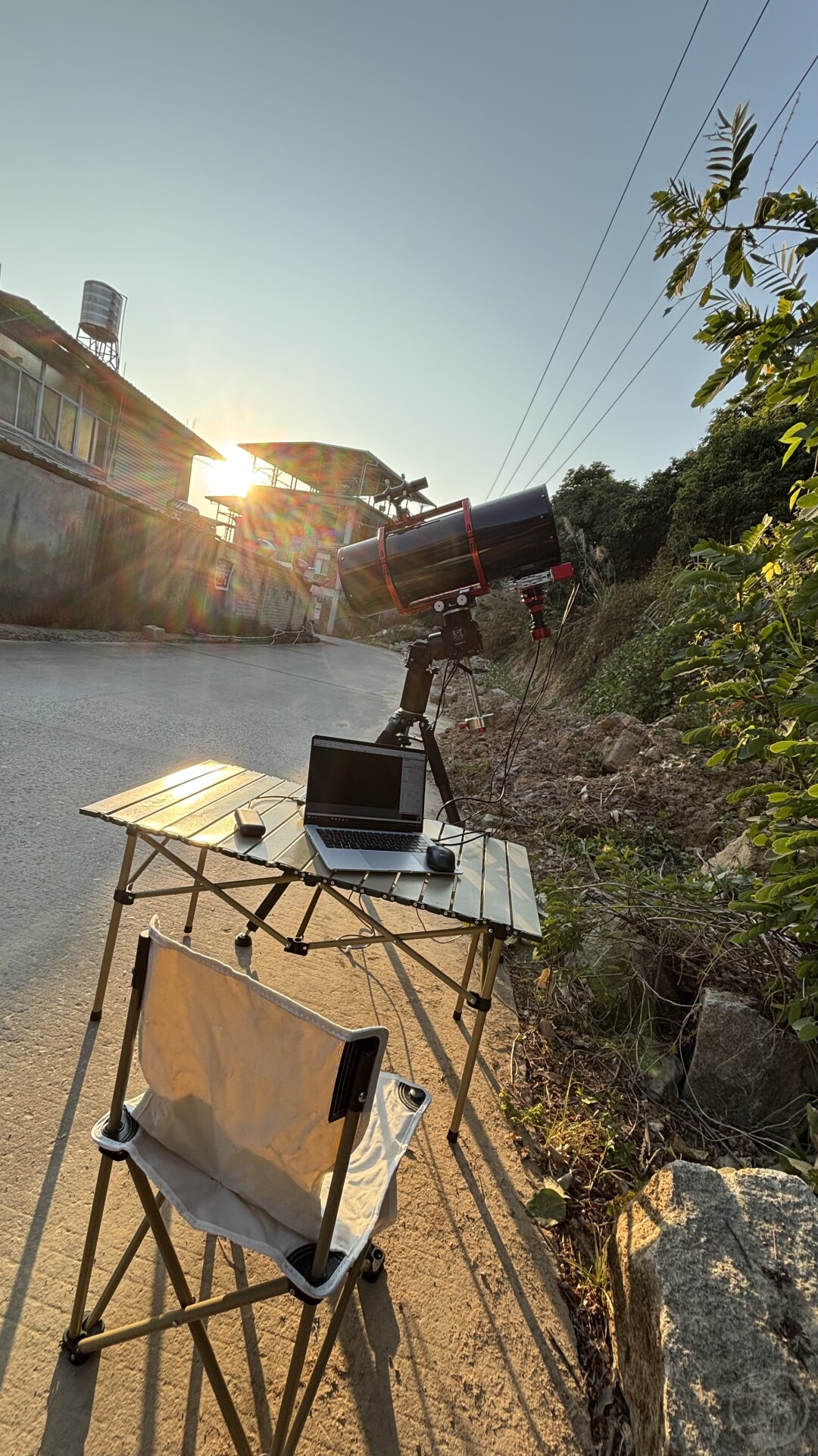 3、这里西向被房子挡住无法通过落日来粗对极轴,只能等太阳被挡住后,大致指到太阳落进去的墙上完成。