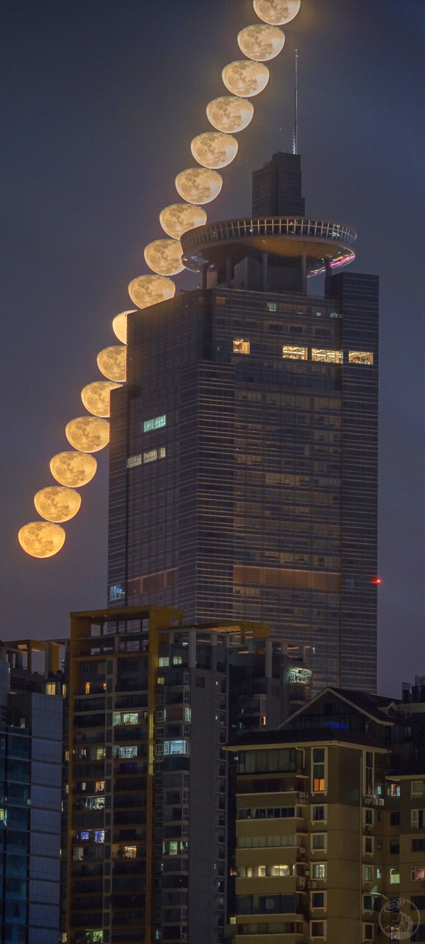 尝试拍摄大光比月升。一般来说拍这种题材要爬楼,这样才可以拍月亮在低角度的时候穿过楼房,此时月亮不会太亮,楼房也不会太黑。这次是在地面拍的,月亮已经升的很高,非常亮,看看相机的宽容度能不能满足这样的条件,拍摄。