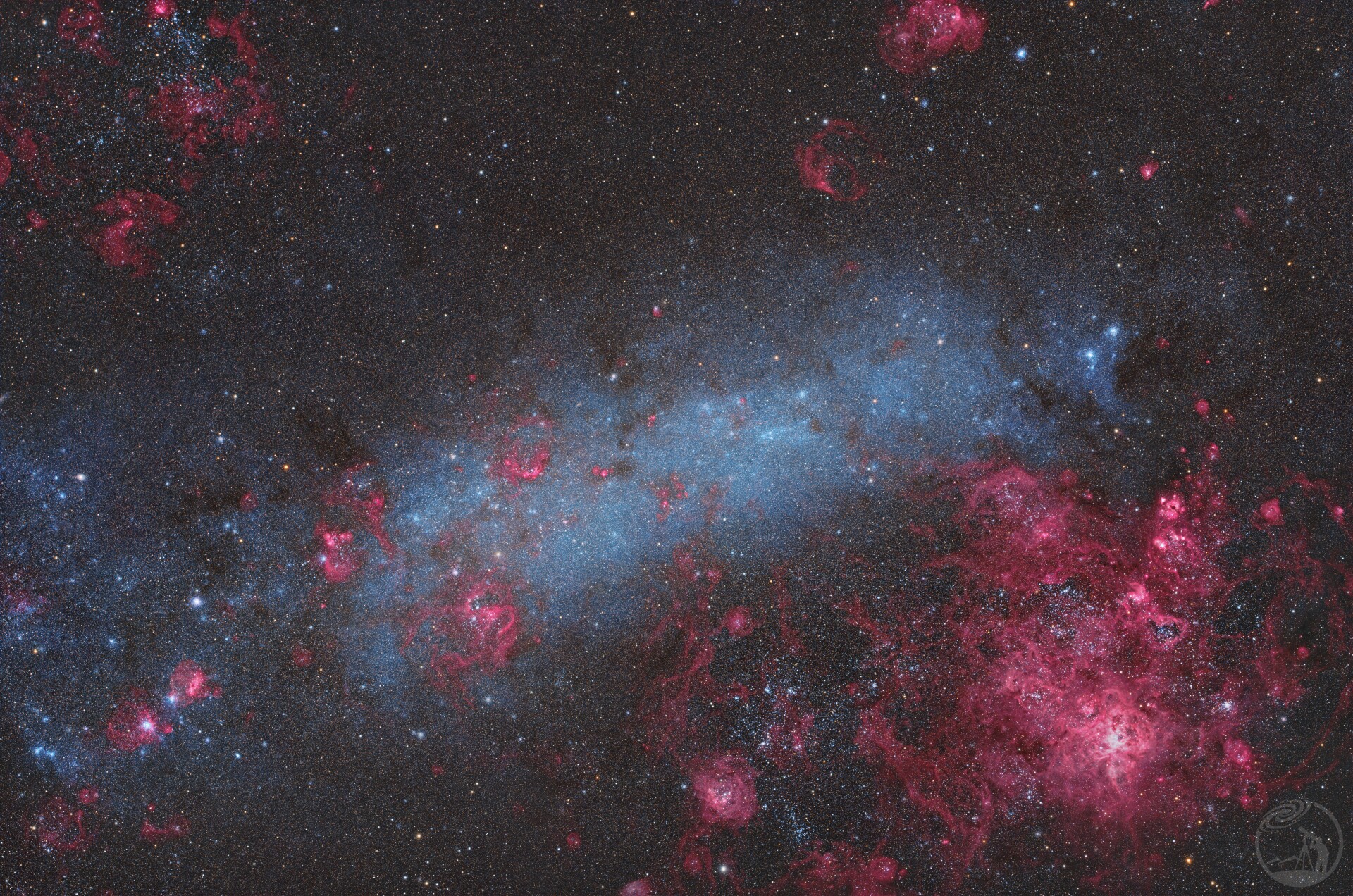 大麦哲伦星系是河外最亮的一个星系,同时也是银河系最大的卫星系。如果说银河系内的群星是肉眼可见的最亮的,那么大麦哲伦星系中的群星则是肉眼不可见的那一群中最闪耀的,强化过的星场则带来更震撼的如沙子一般多且粒粒分明的效果。