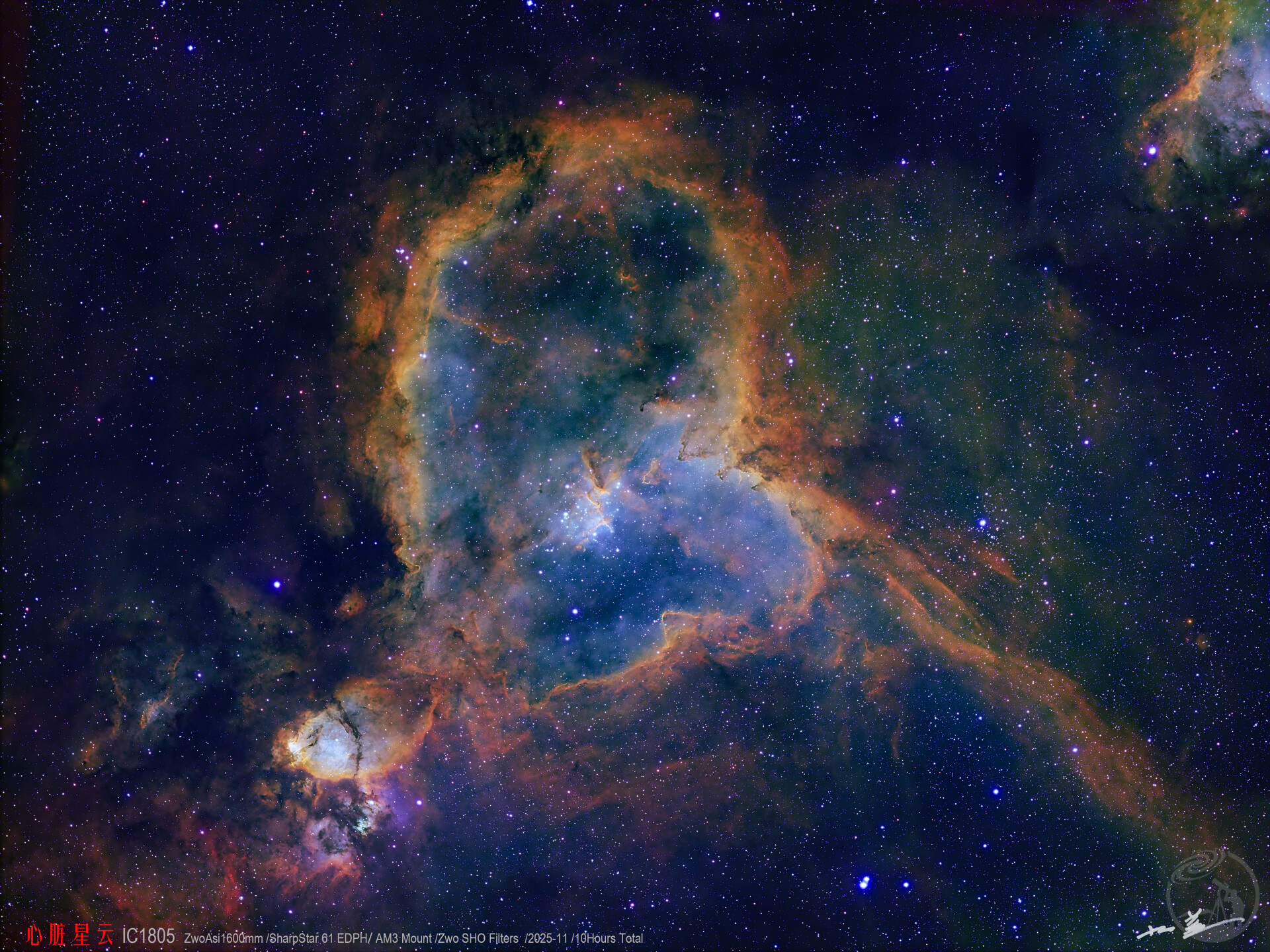 位于仙后座的发射星云,距离地球约7500光年,因心形轮廓得名,核心为Melotte15星团。2025-11月拍摄,共拍摄两晚,共约10+小时。使用锐星61edph,Asi1600mm拍摄zwo SHO滤镜