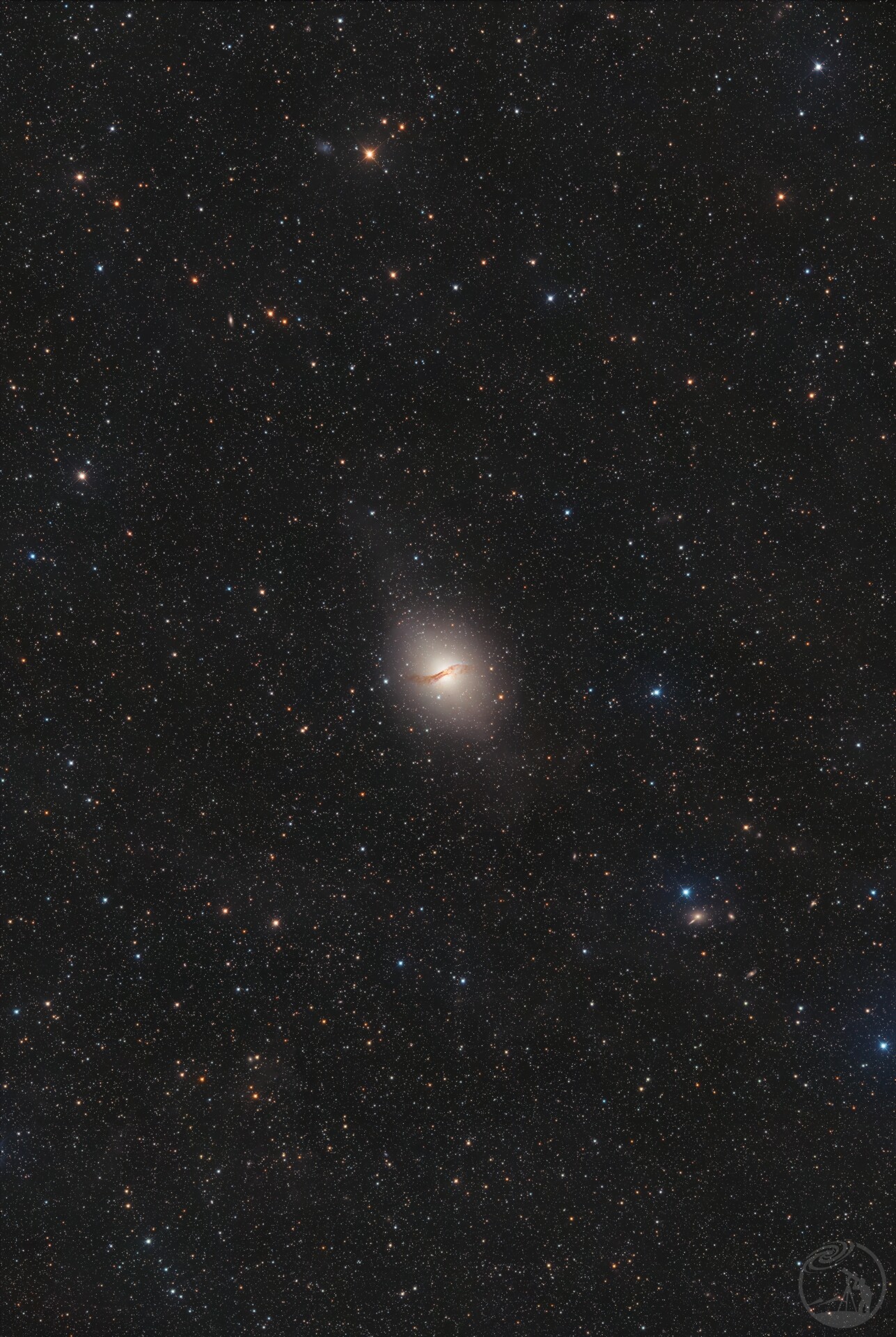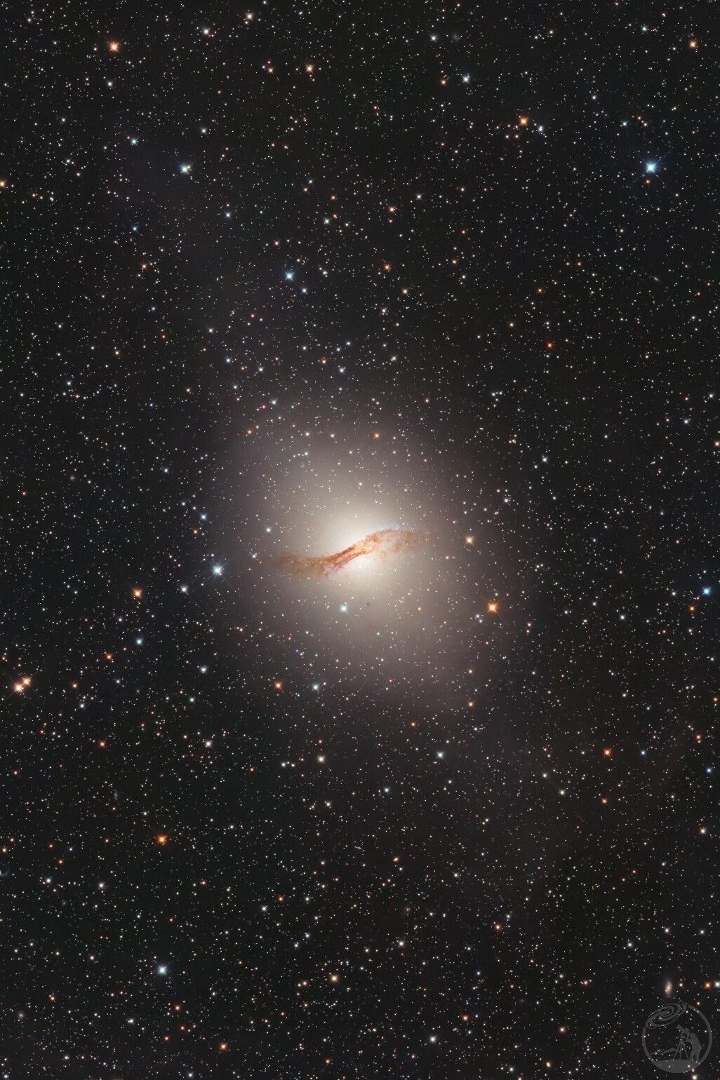 使用了智利天文台的高桥大黄T180超级摄星镜,拍摄了一个小时的半人马座a星系。巨大广阔的椭圆核心从中心向四周扩展,弥散的光晕中有数以千亿颗垂垂老矣的恒星,还有一条跨度十万光年的尘埃带,两端翘曲着横跨椭圆星系的光晕 一个南天明亮的透镜星系无比震撼的呈现在我面前。